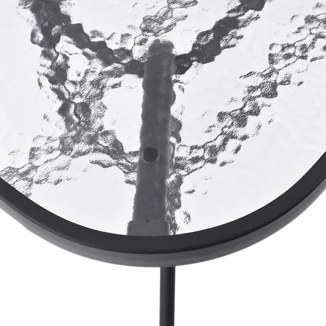 Ένα τραπέζι μεταλλικό εξωτερικού χώρου σε χρώμα γκρι, με ενσωματωμένο γυαλί ασφαλείας (tempered).