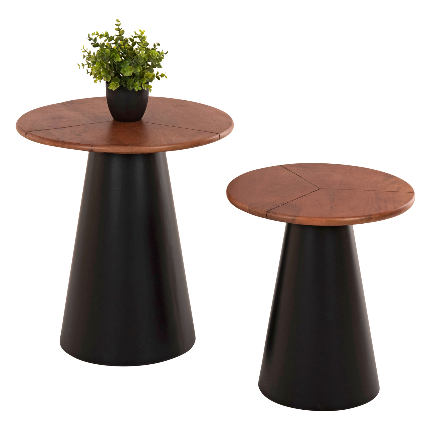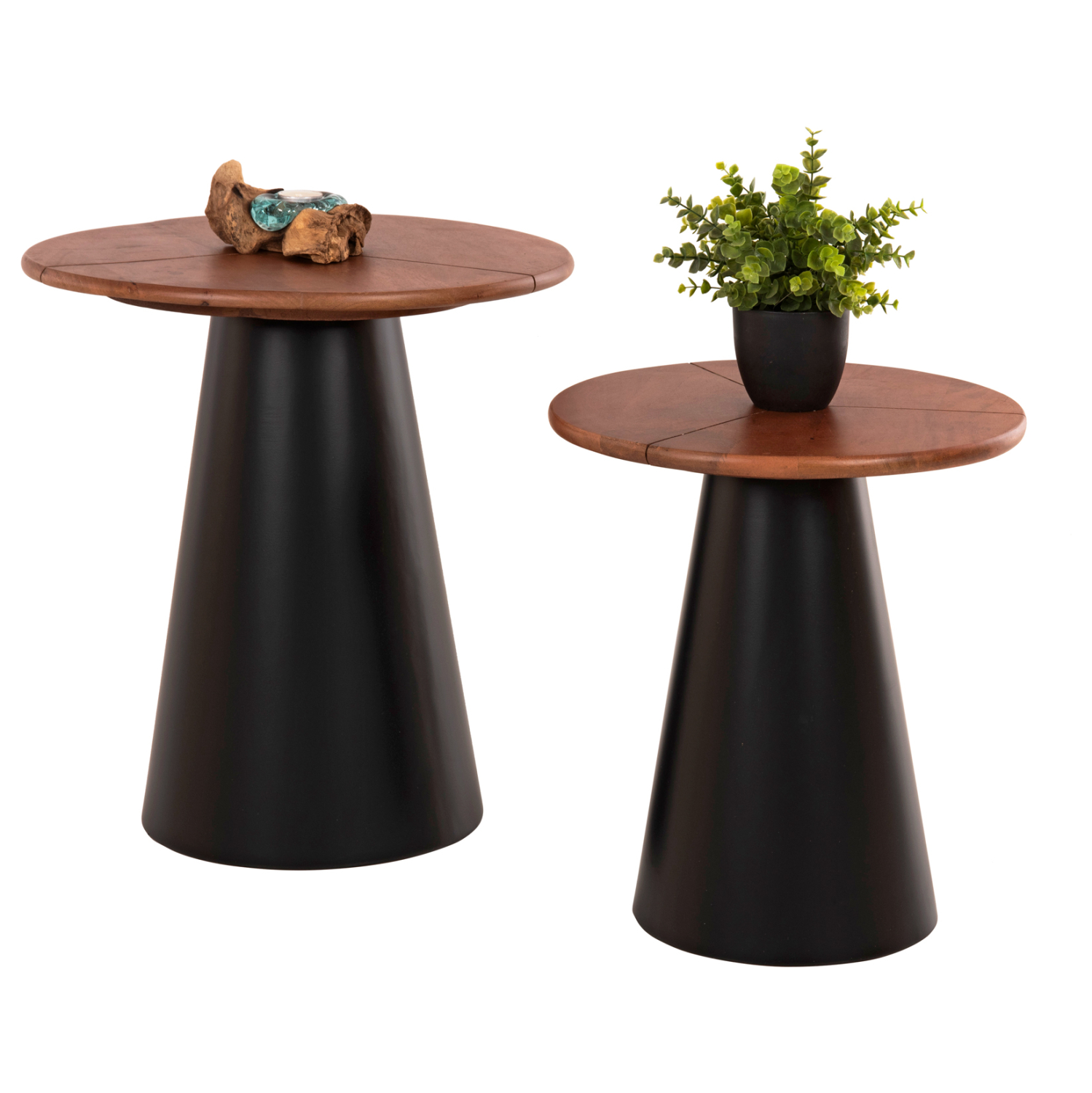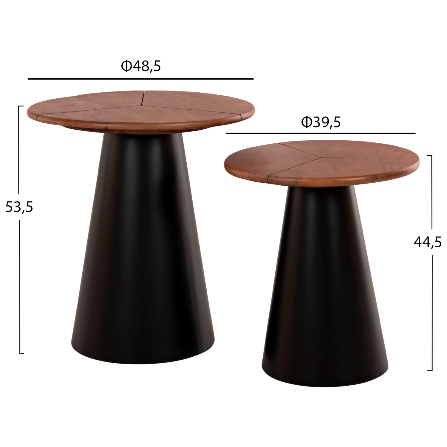 Το σετ 2 τραπεζιών SUNNI για το σαλόνι είναι μια από τις νέες προσθήκες στην γκάμα μας. Πρόκειται για 2 μεταλλικά τραπεζάκια στρογγυλά με κωνική βάση. Το χρώμα τους είναι ΜΑΥΡΟ. Οι επιφάνειες είναι από ποιοτικό ξύλο σε καρυδί απόχρωση. Ιδανικά τόσο για το σπίτι, όσο και για επαγγελματικούς χώρους.