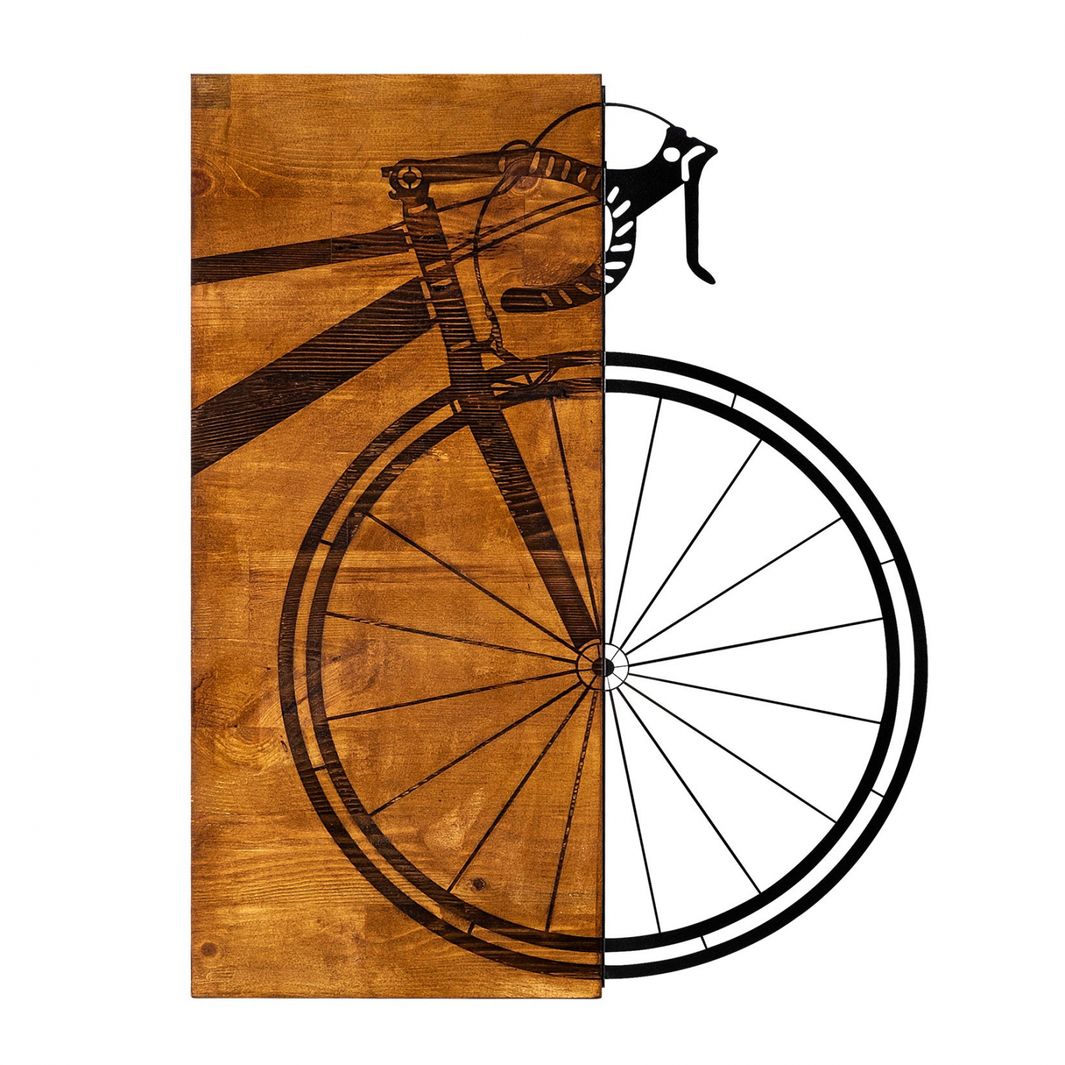 Το σχέδιο της είναι ένα ποδήλατο σε μαύρη απόχρωση, το κεντρικό σημείο του οποίου βρίσκεται πάνω σε ξύλο φυσικής απόχρωσης.