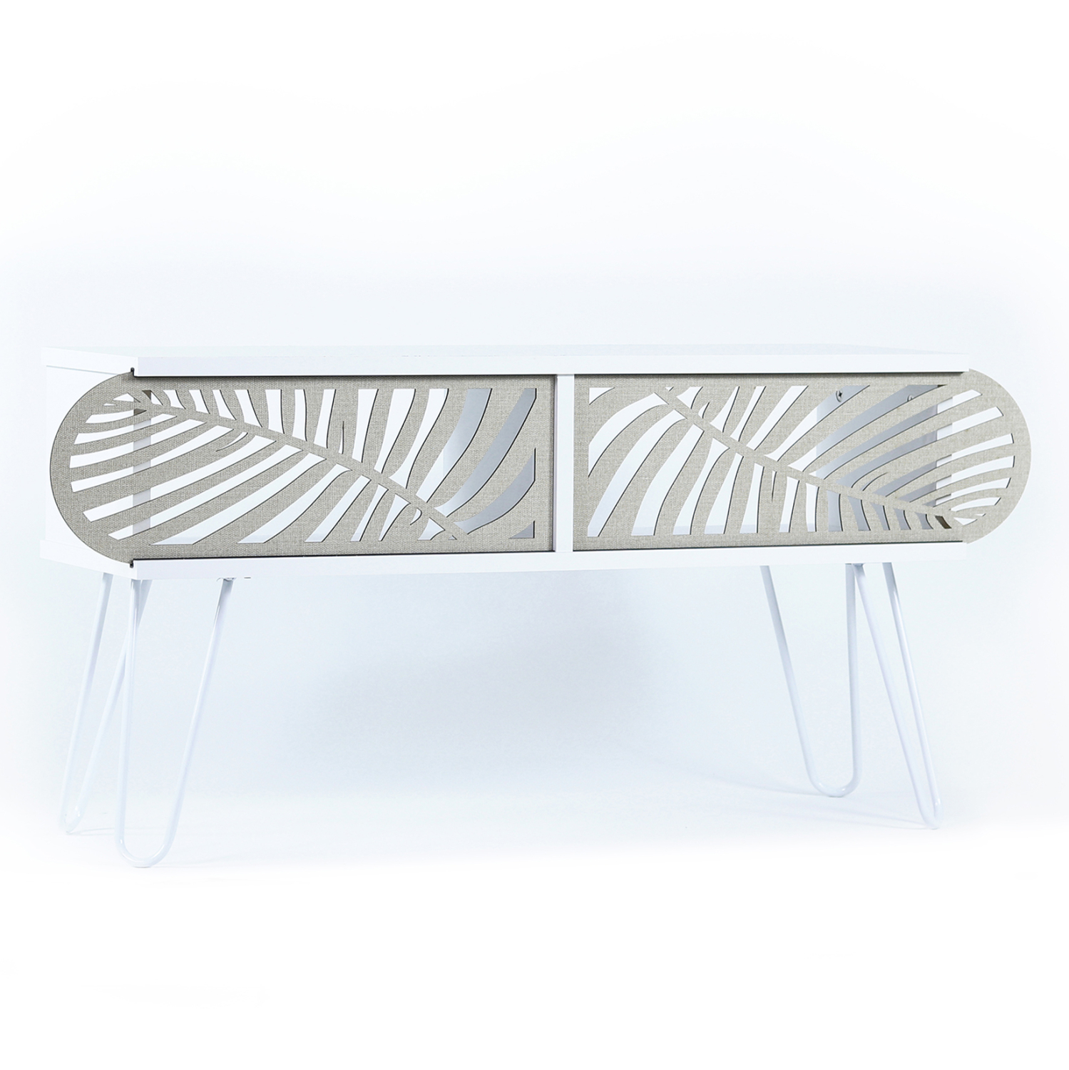 Έπιπλο τηλεόρασης με συρόμενα πορτάκια σε λευκή απόχρωση με λεπτομέρειες σε εκρού χρώμα.