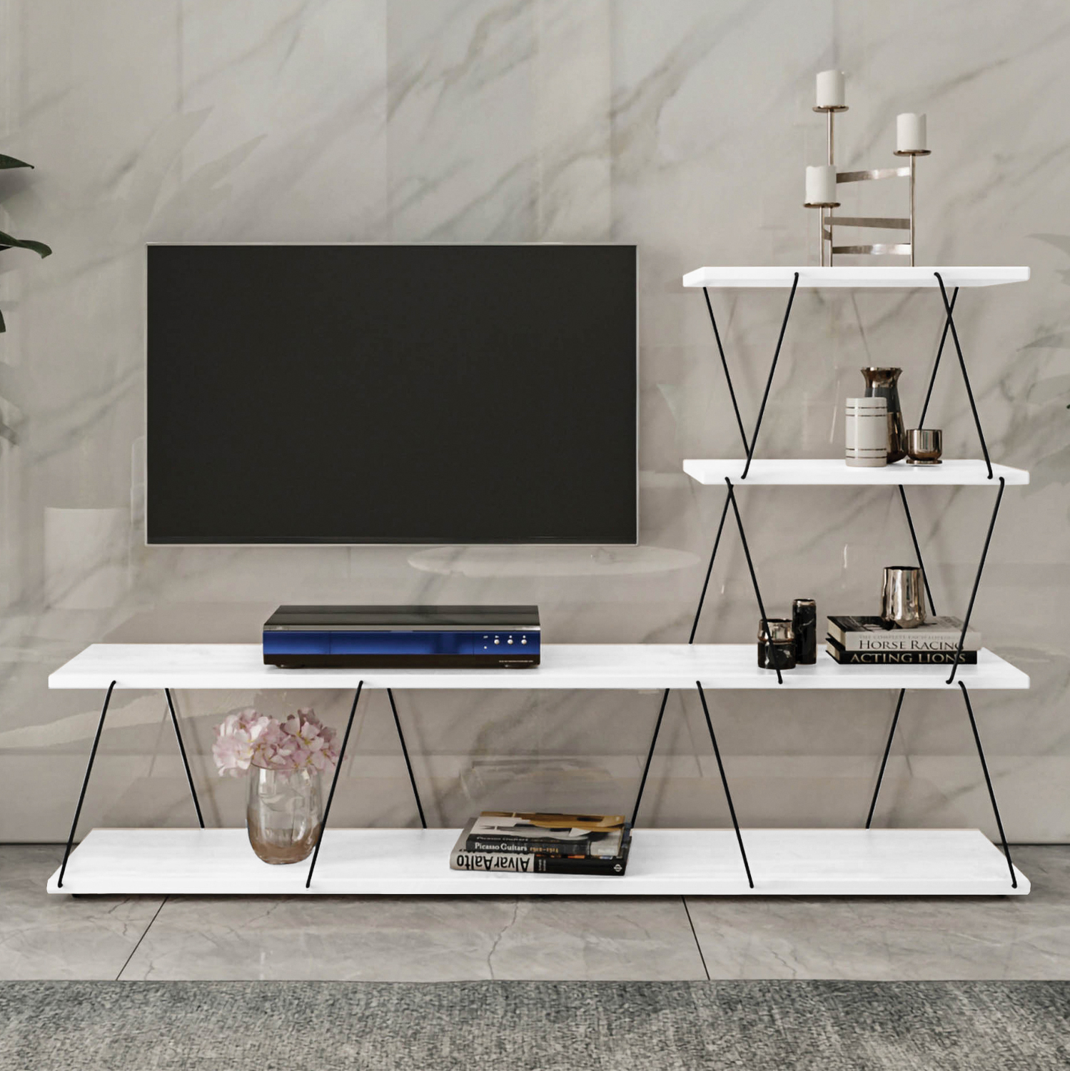 Διαθέτει τέσσερεις επιφάνειες τοποθέτησης αντικειμένων και για τις ηλεκτρονικές συσκευές σας με ενώσεις από μαύρες μεταλλικές ράβδους.