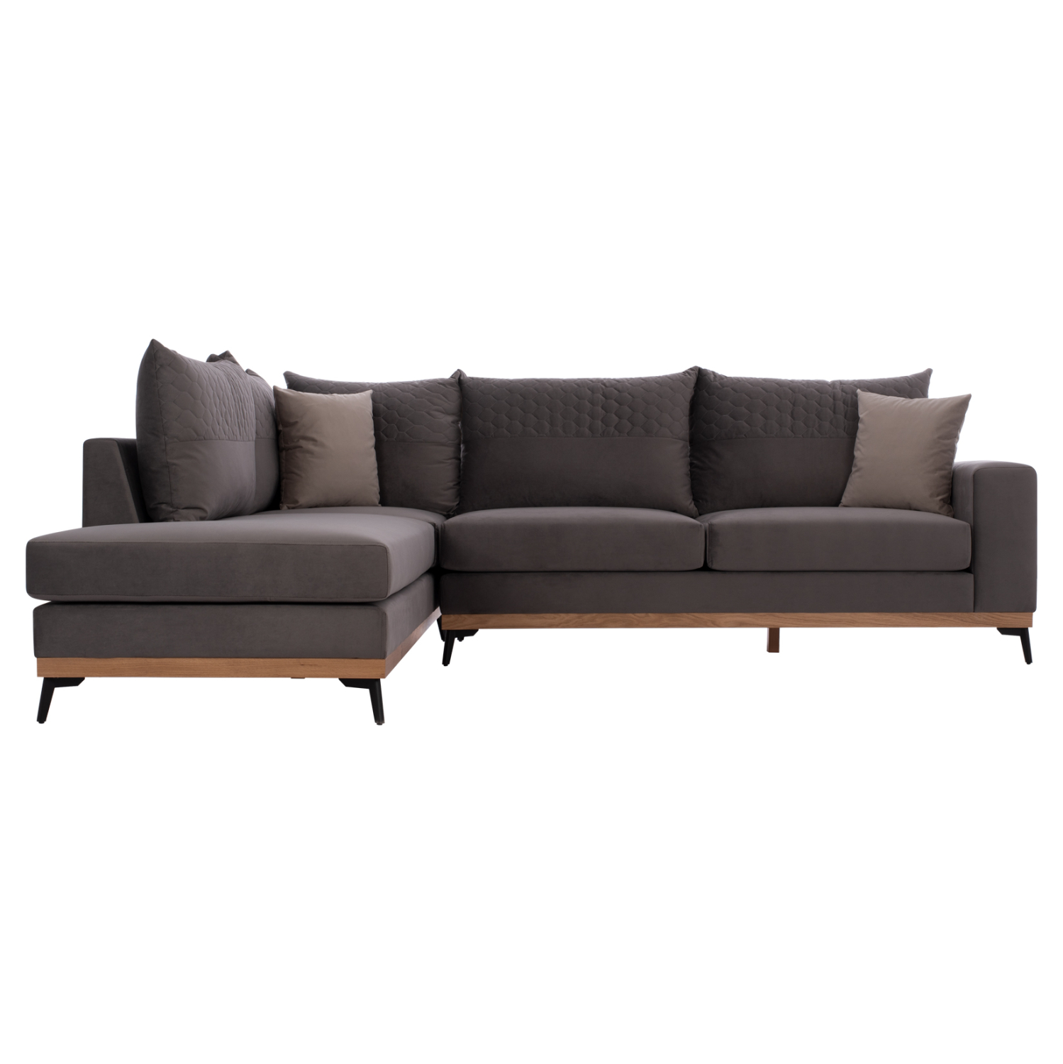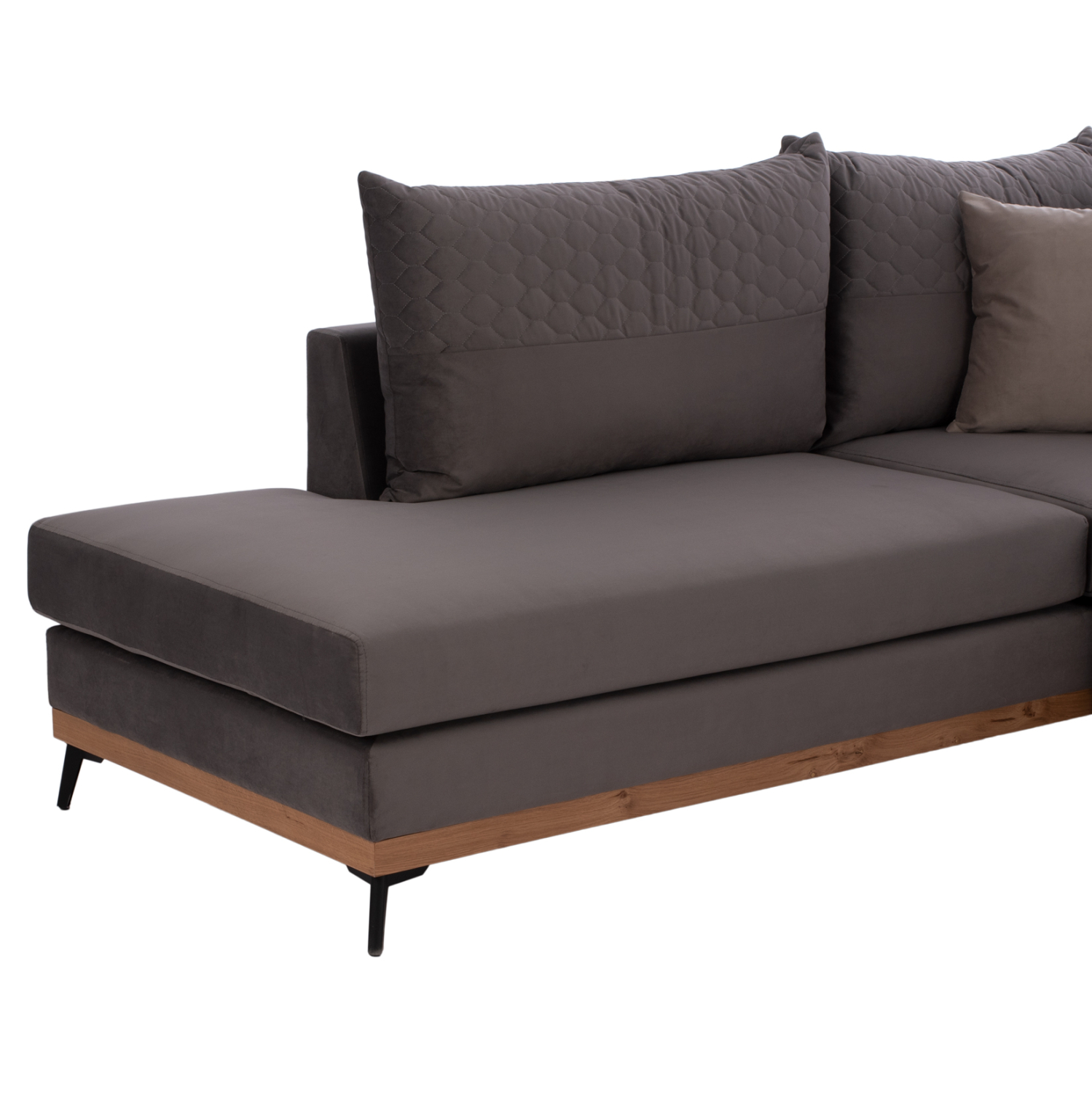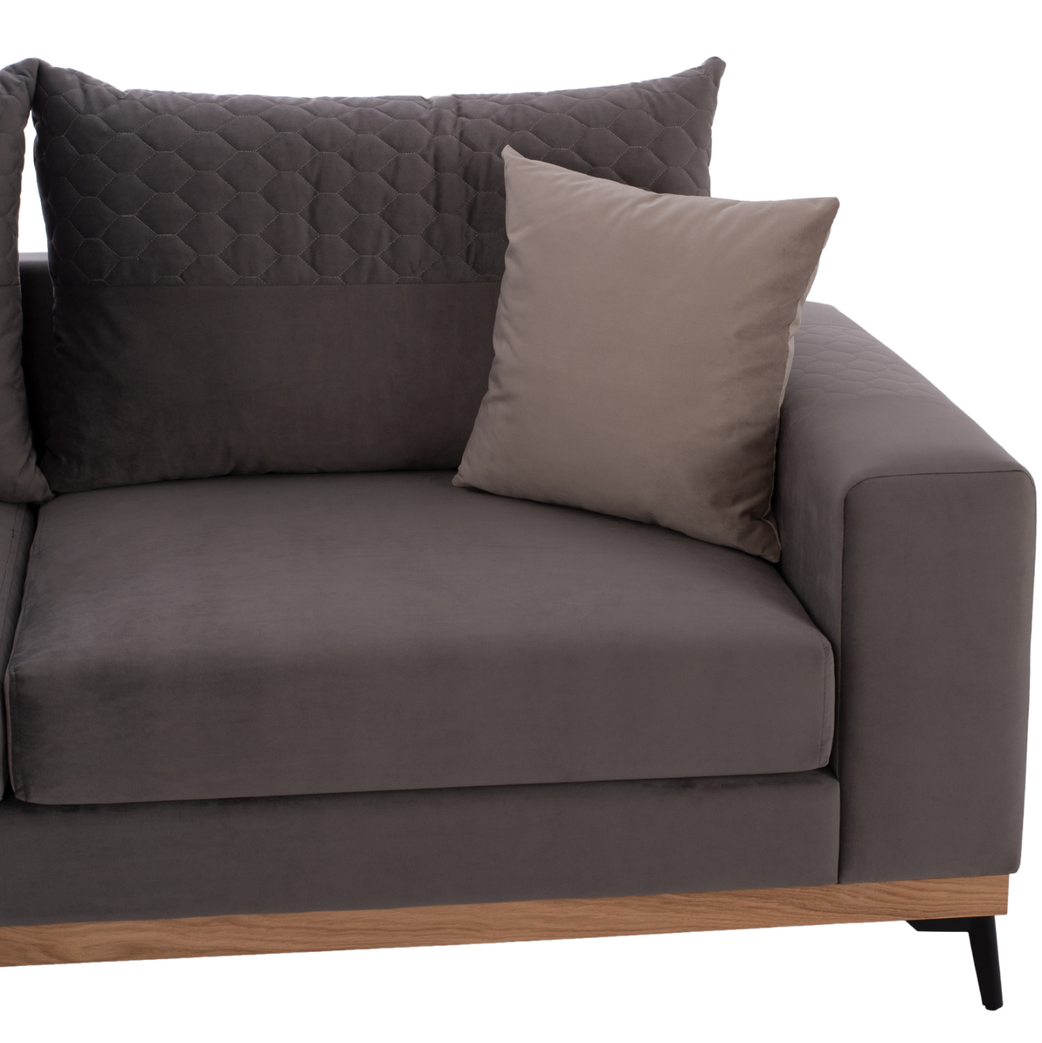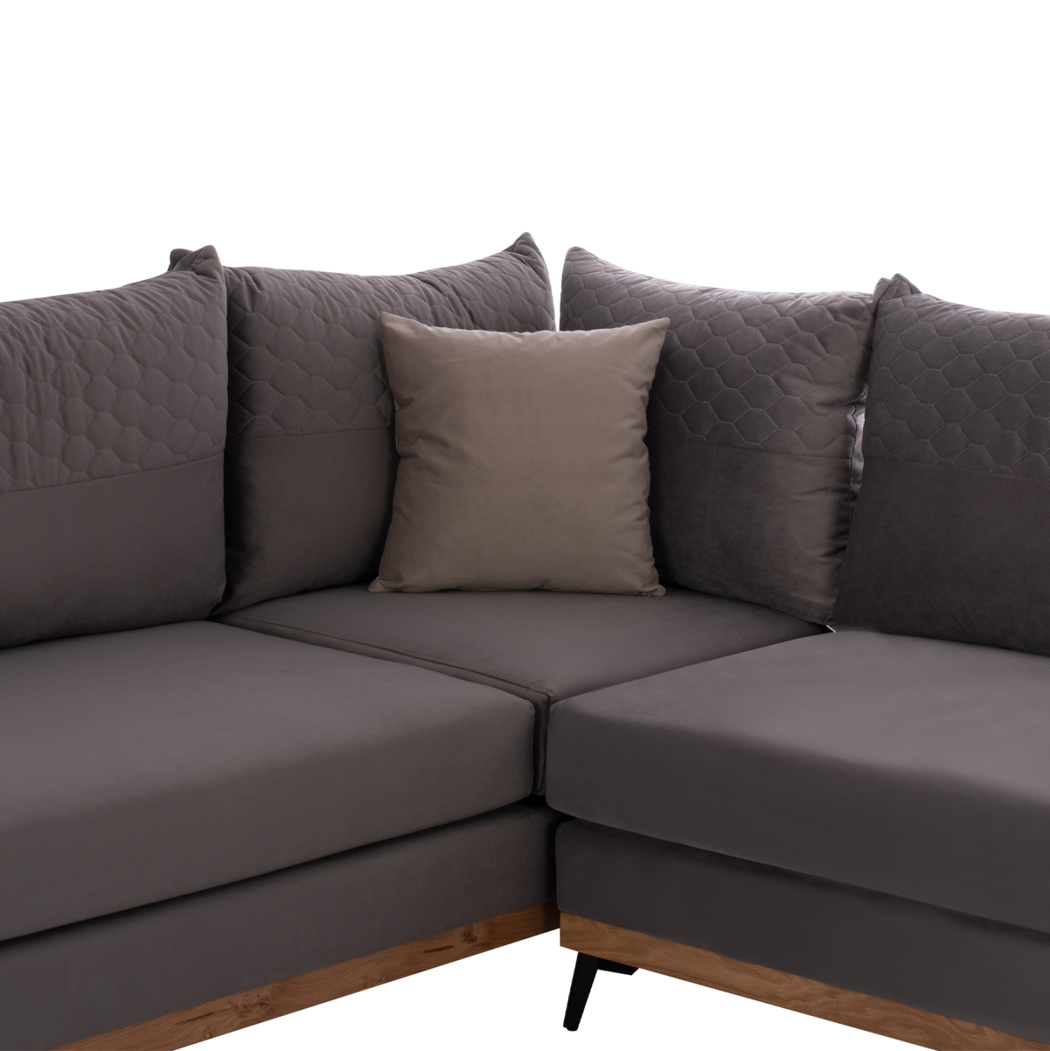 Ξεκινώντας από τα βασικά και τα προφανή, το χρώμα της βελούδινης επένδυσης του μεγάλου αυτού καναπέ είναι SAHARA 13- γκρι. Διαθέτει 5 μαξιλάρια πλάτης στο ίδιο χρώμα και δύο μικρότερα διακοσμητικά μαξιλάρια σε SAHARA 16- ανοιχτό γκρι χρώμα. Τα 4 μαξιλάρια καθίσματος σε συνδυασμό με αυτά της πλάτης, δίνουν την τέλεια αίσθηση άνεσης! Τα μαξιλάρια πλάτης έχουν τεχνοτροπία καπιτονέ κατά το ήμισυ, όπως υπάρχει και μια πανέμορφη καπιτονέ λωρίδα στο μεγάλο μπράτσο. Τα μαξιλάρια στο πίσω μέρος τους, έχουν πιο ανοιχτό γκρι χρώμα, ενώ ακόμα πιο ανοιχτό είναι το χρώμα των δύο μικρών διακοσμητικών μαξιλαριών. Το μεγάλο μαξιλάρι καθίσματος που σχηματίζει την γωνία δεν θα δυσκολέψει τον χρήστη φεύγοντας από την θέση του, επειδή διαθέτει «χρατς» και κολλάει στην ειδική επιφάνεια του σκελετού. Το κομμάτι που δημιουργεί την αριστερή γωνία, είναι κουμπωτό και συνδέεται με τον υπόλοιπο καναπέ αρμονικά με ενισχυμένους γαλβανιζέ αναρτήρες πάνελ (κατακόρυφα συρταρωτά) για τεράστια αντοχή και ευκολία στην χρήση.
