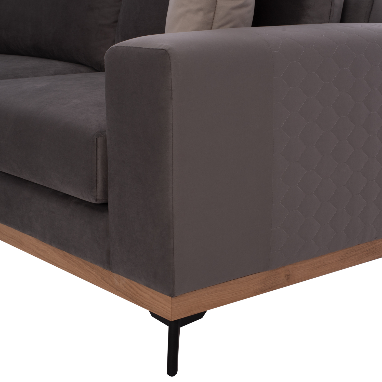 Το βασικό χαρακτηριστικό του καναπέ, όμως, που μαγνητίζει το βλέμμα είναι φυσικά το ξύλινο πλαίσιο σε φυσικό χρώμα που διατρέχει ολόκληρο τον καναπέ στο κάτω μέρος, ακριβώς επάνω από το ύψος των ποδιών. Πραγματικά μια πανέμορφη πινελιά που ανεβάζει αισθητικά τον καναπέ. Τα πόδια είναι ψηλά και βοηθάνε στην καλύτερη πρόσβαση στο πάτωμα κάτω από τον καναπέ, κυρίως για την καθαριότητα, χωρίς να χρειαστεί να μετακινηθεί ολόκληρος ο καναπές.