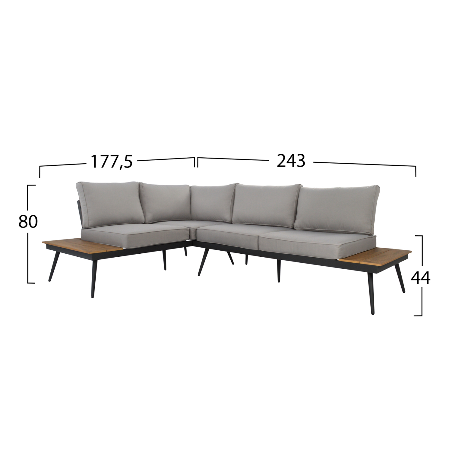 Καναπές γωνία με μεγάλα μαξιλάρια από ύφασμα σε γκρι χρώμα και σκελετό αλουμινίου σε σκούρο γκρι χρώμα σε συνδυασμό με λεπτομέρειες από υλικό polywood σε απόχρωση του ξύλου.