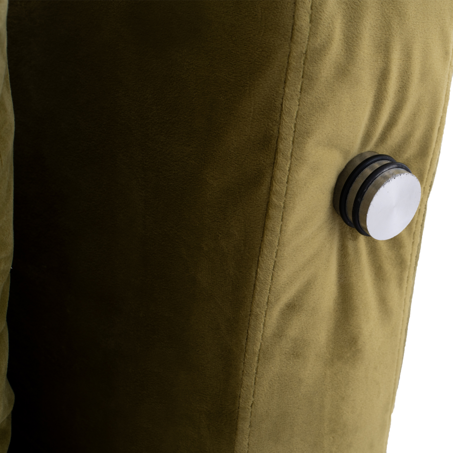 Κατασκευασμένος από βελούδινο ύφασμα σε λαδί απόχρωση, με μεγάλα μαξιλάρια και μεταλλικά πόδια σε μαύρη απόχρωση.