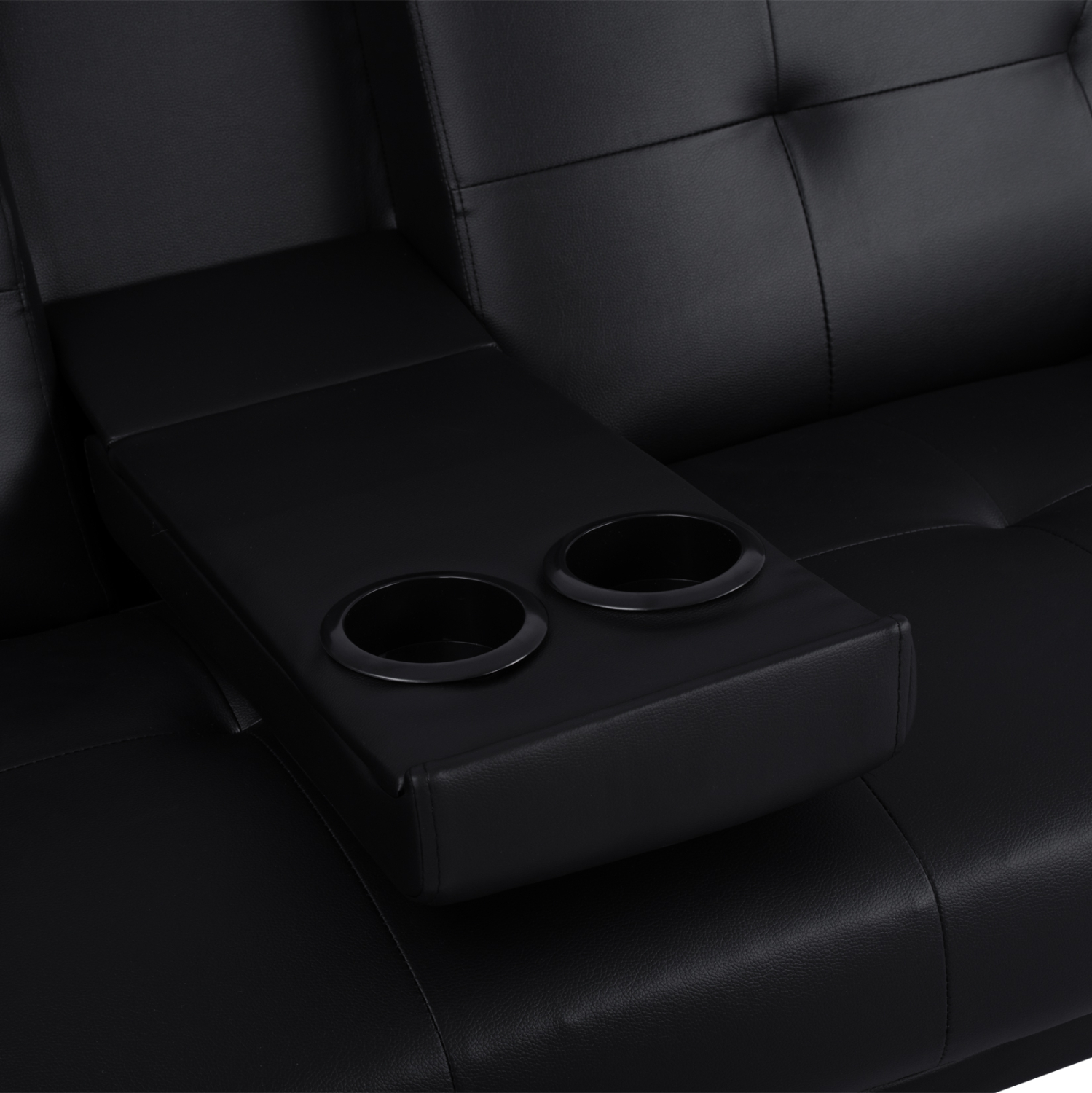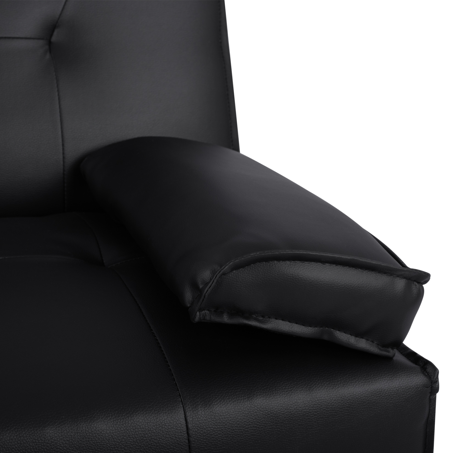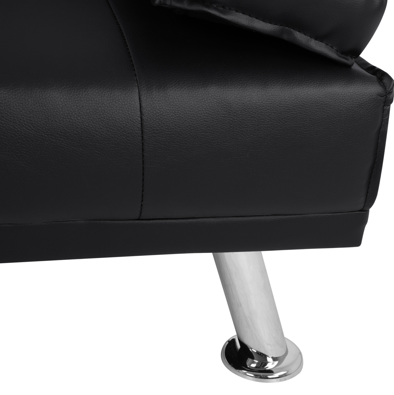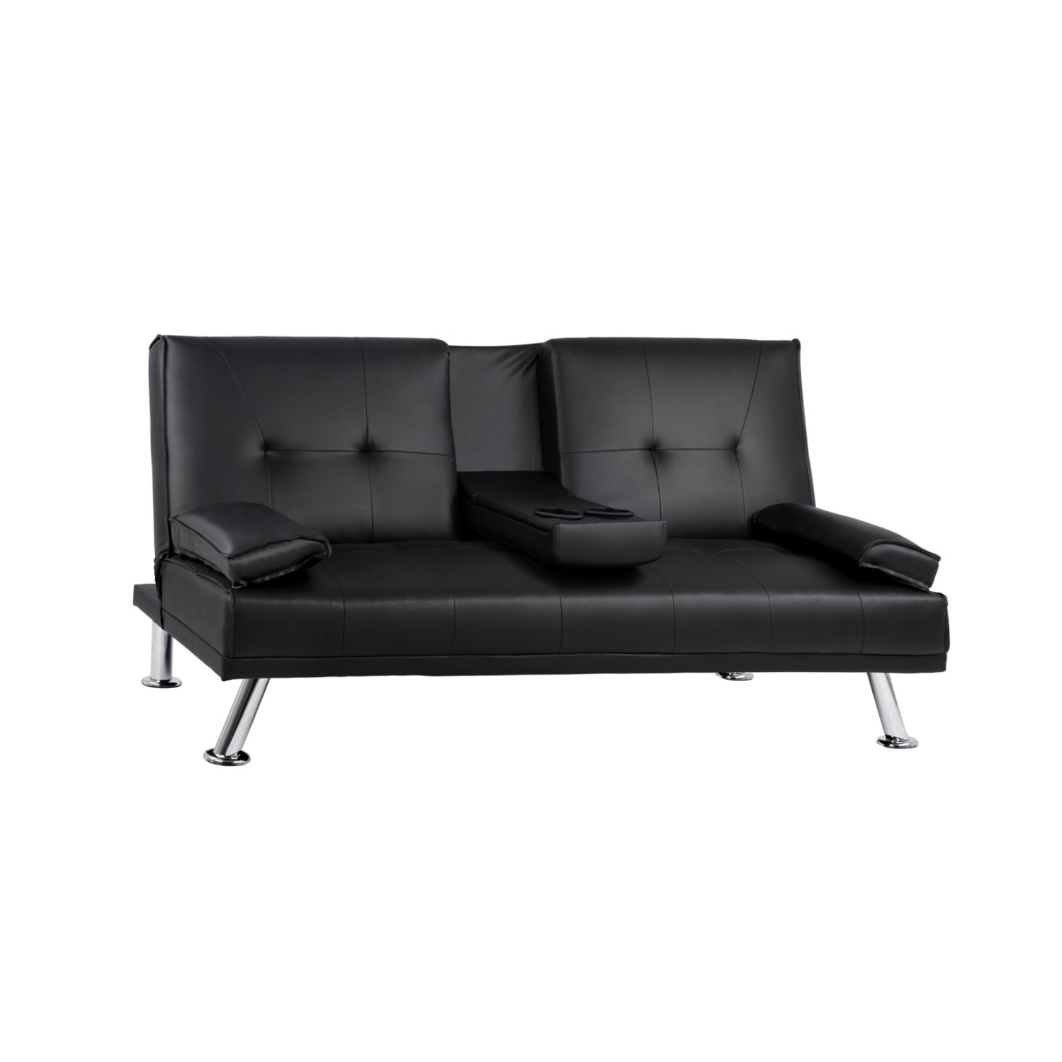 Μοντέρνος καναπές – κρεβάτι επενδυμένος με μαύρο pu και μεταλλικά πόδια, με πτυσσόμενο μπράτσο στο κέντρο του, με ειδικές θήκες για την τοποθέτηση ποτηριών.