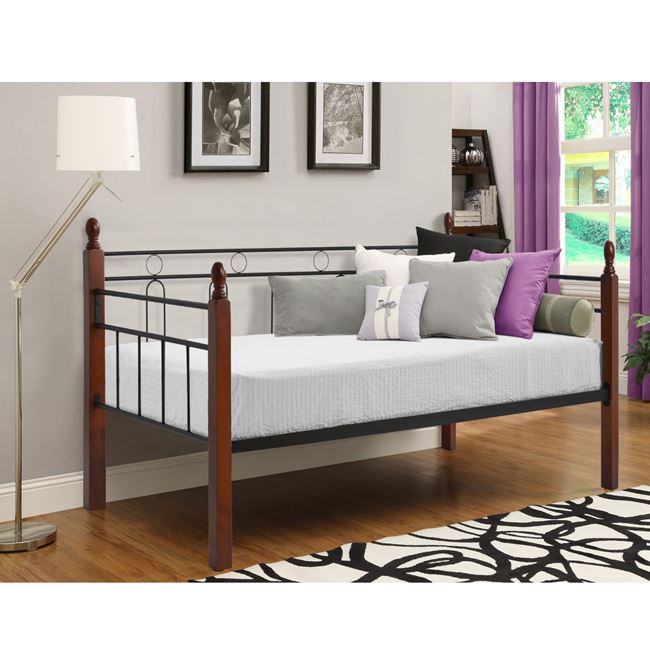 Τα πόδια-κολώνες του κρεβατοκαναπέ είναι από μασίφ ξύλο , ενώ όλο το υπόλοιπο είναι μεταλλικό.