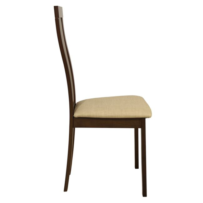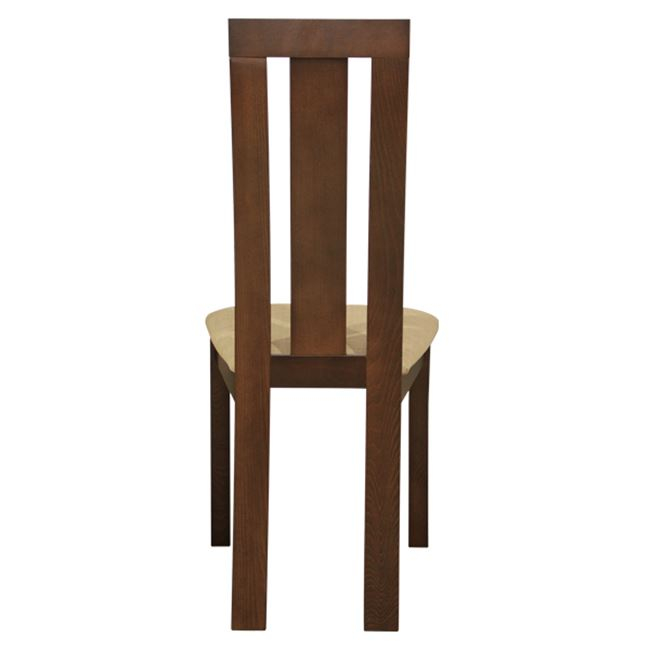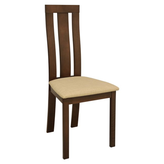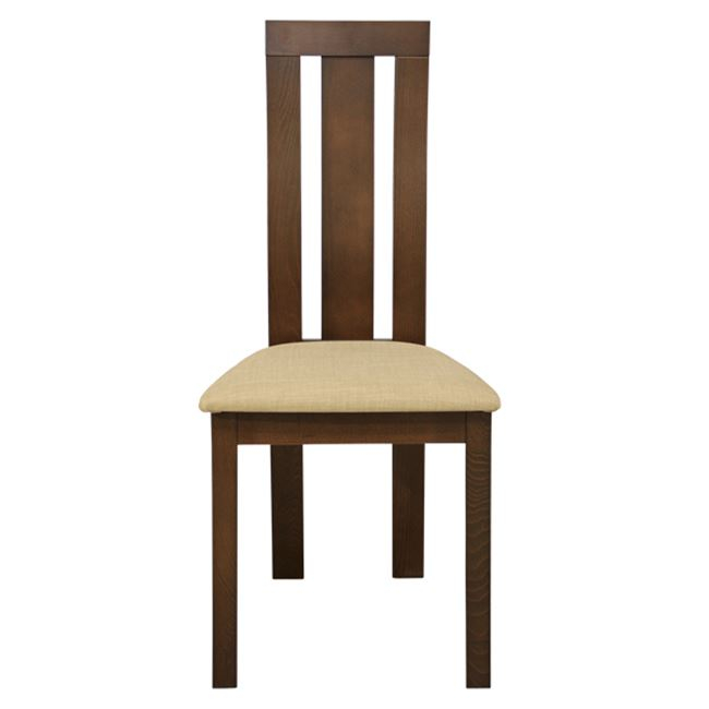 Καρέκλα τραπεζαρίας από μασίφ σκελετό σε καρυδί χρώμα. Η πλάτη της καρέκλας διαθέτει ένα επιπλέον τμήμα από ξύλο και κάθισμα με υφασμάτινη επένδυση σε μπεζ χρώμα.
