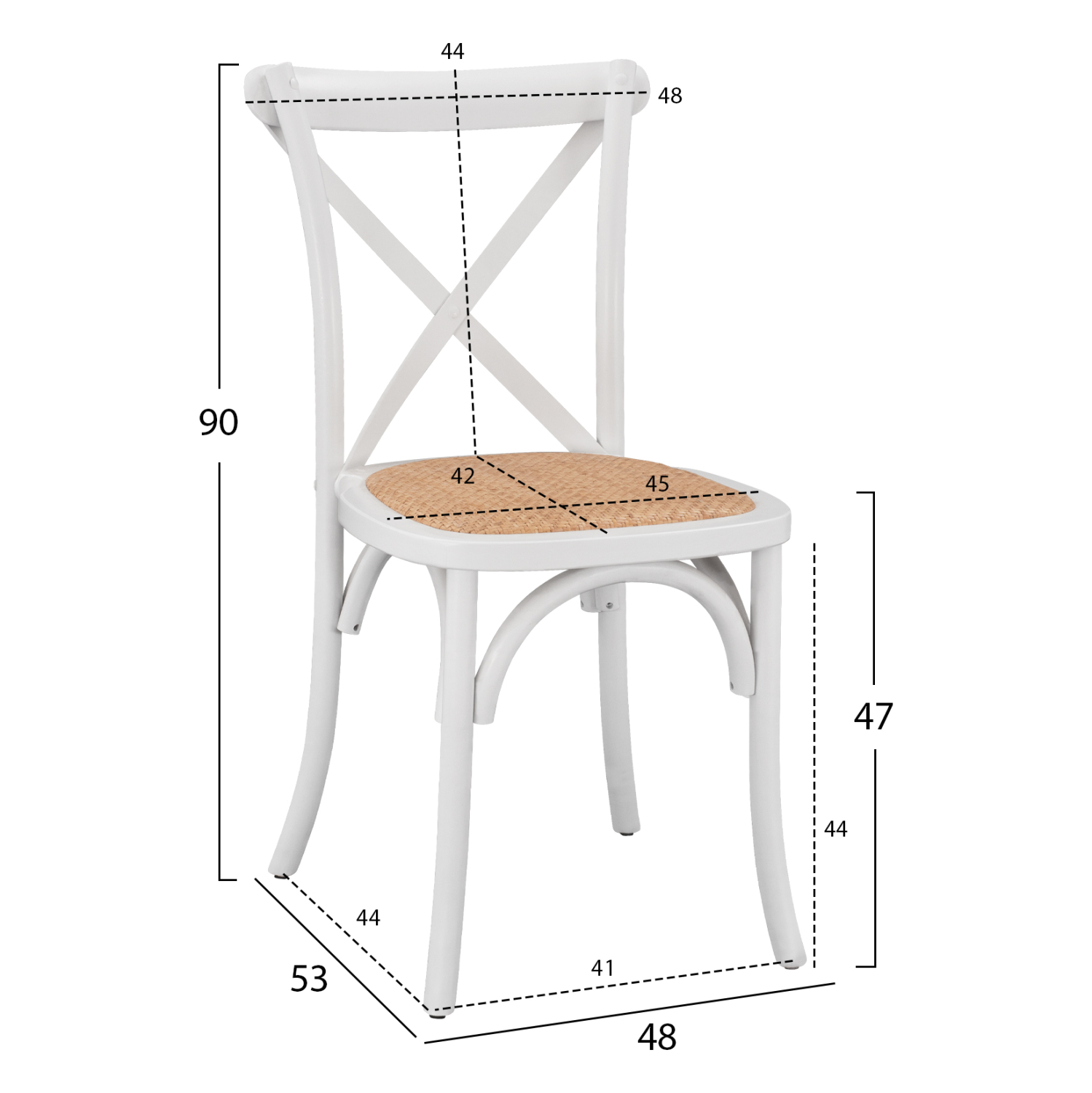 Η καρέκλα είναι κατασκευασμένη από υψηλής αντοχής ξύλο οξιάς σε λευκή απόχρωση, ενώ το κάθισμα της καρέκλας είναι από ψάθα με χειροποίητη πλέξη.