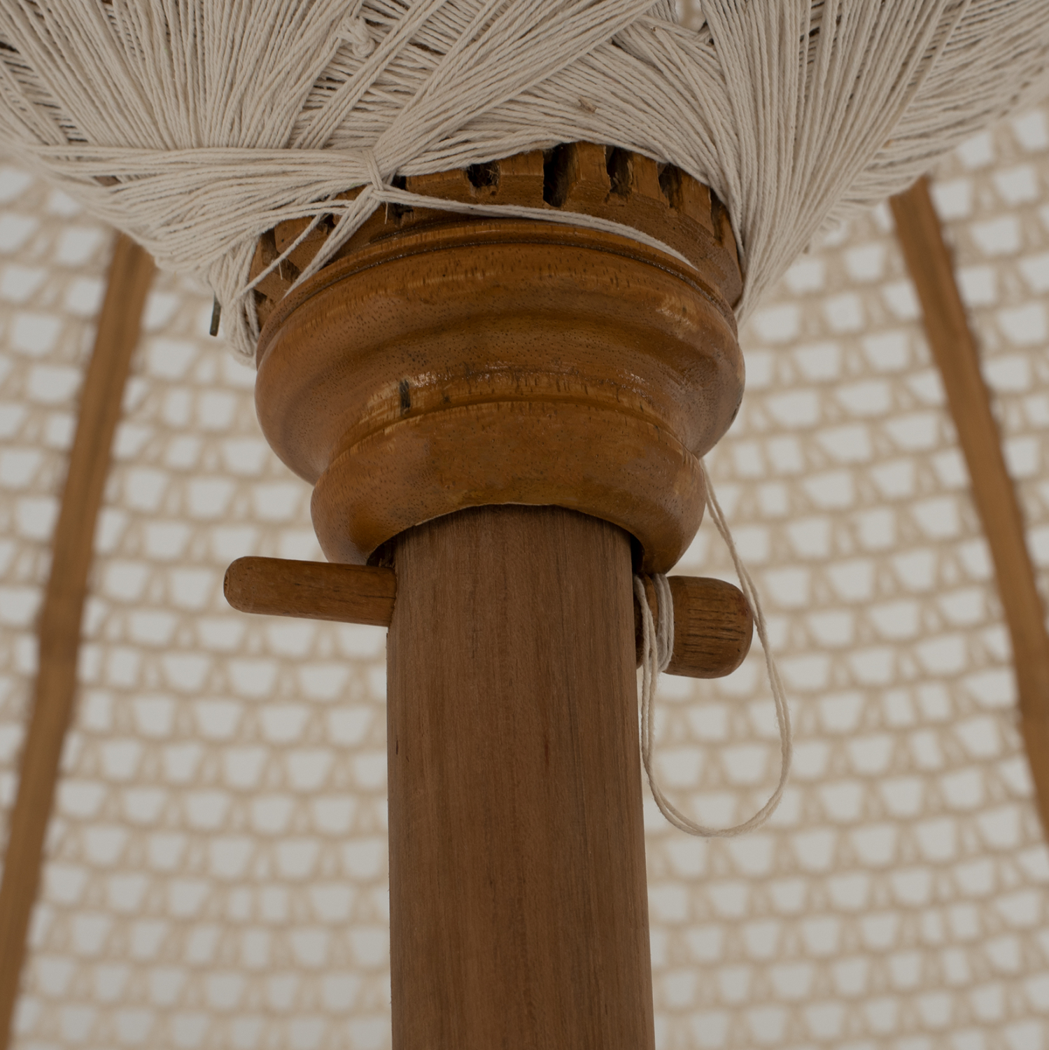 Η ομπρέλα ΗΜ6036.01 είναι πραγματικά πανέμορφη. Ο στύλος της είναι από μασίφ ξύλο ΤΕΑΚ ενώ τα «μπράτσα» της ομπρέλας είναι από ξύλο BAMBOO. Το ιδιαίτερο χαρακτηριστικό, όμως, αυτής της εκπληκτικής ομπρέλας είναι ότι το σκίαστρό της είναι φτιαγμένο από μακραμέ σε ΕΚΡΟΥ χρώμα. Μια ομπρέλα που μπορεί να χρησιμοποιηθεί με πολλούς τρόπους κυρίως σε επαγγελματικούς χώρους και να προσφέρει με τις διαστάσεις της σκίαση με…στυλ!
