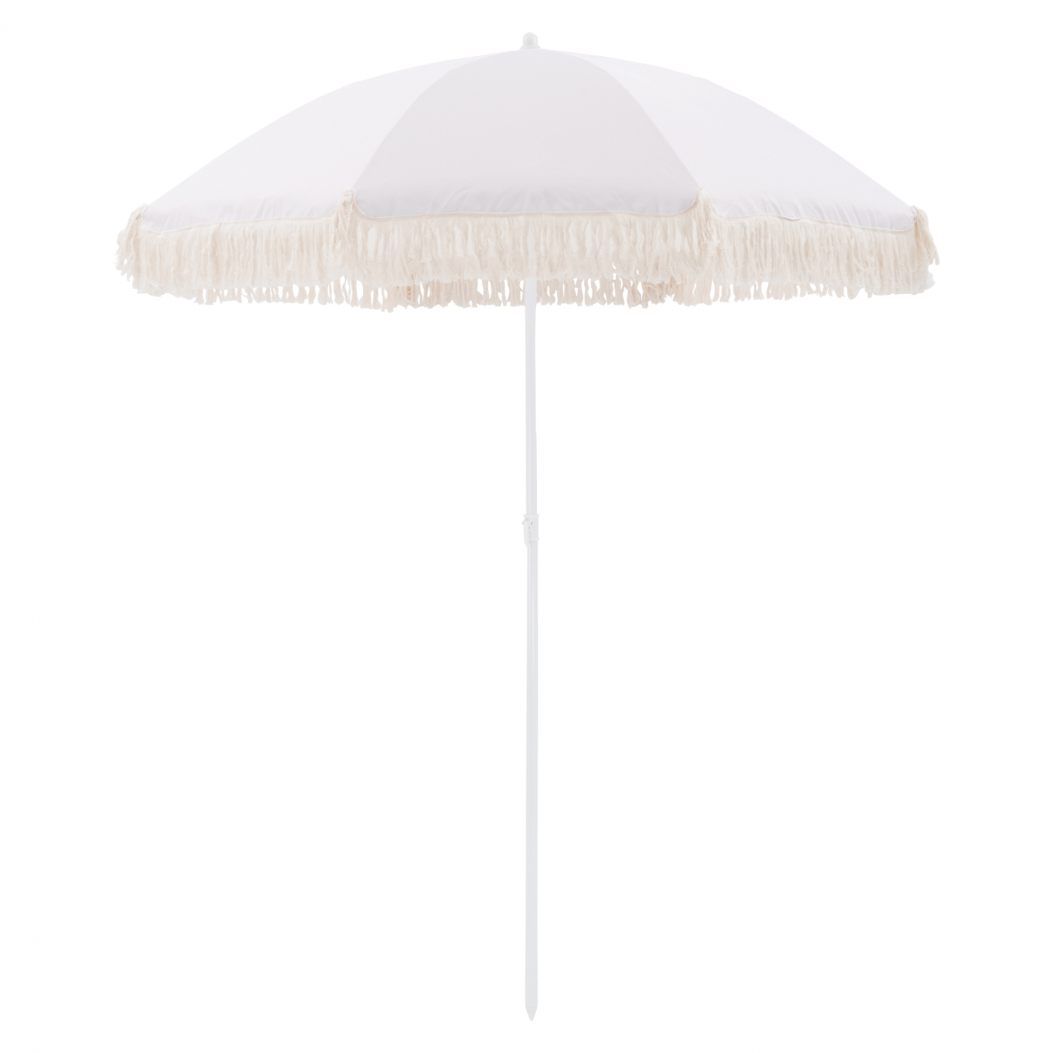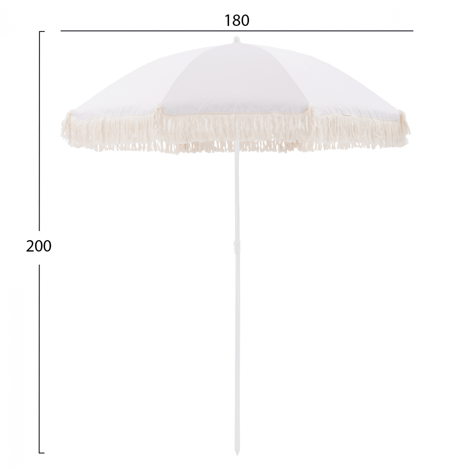 Ομπρέλα θαλάσσης στρογγυλή και flaps από κρόσια μακραμέ, σε μπεζ απόχρωση.