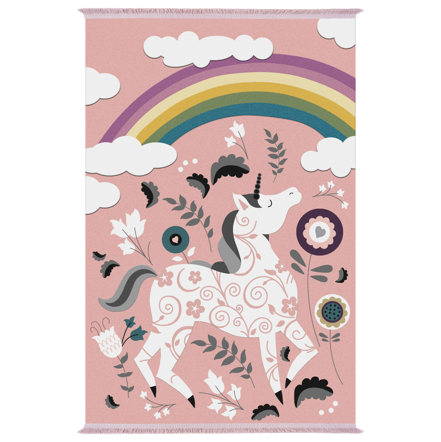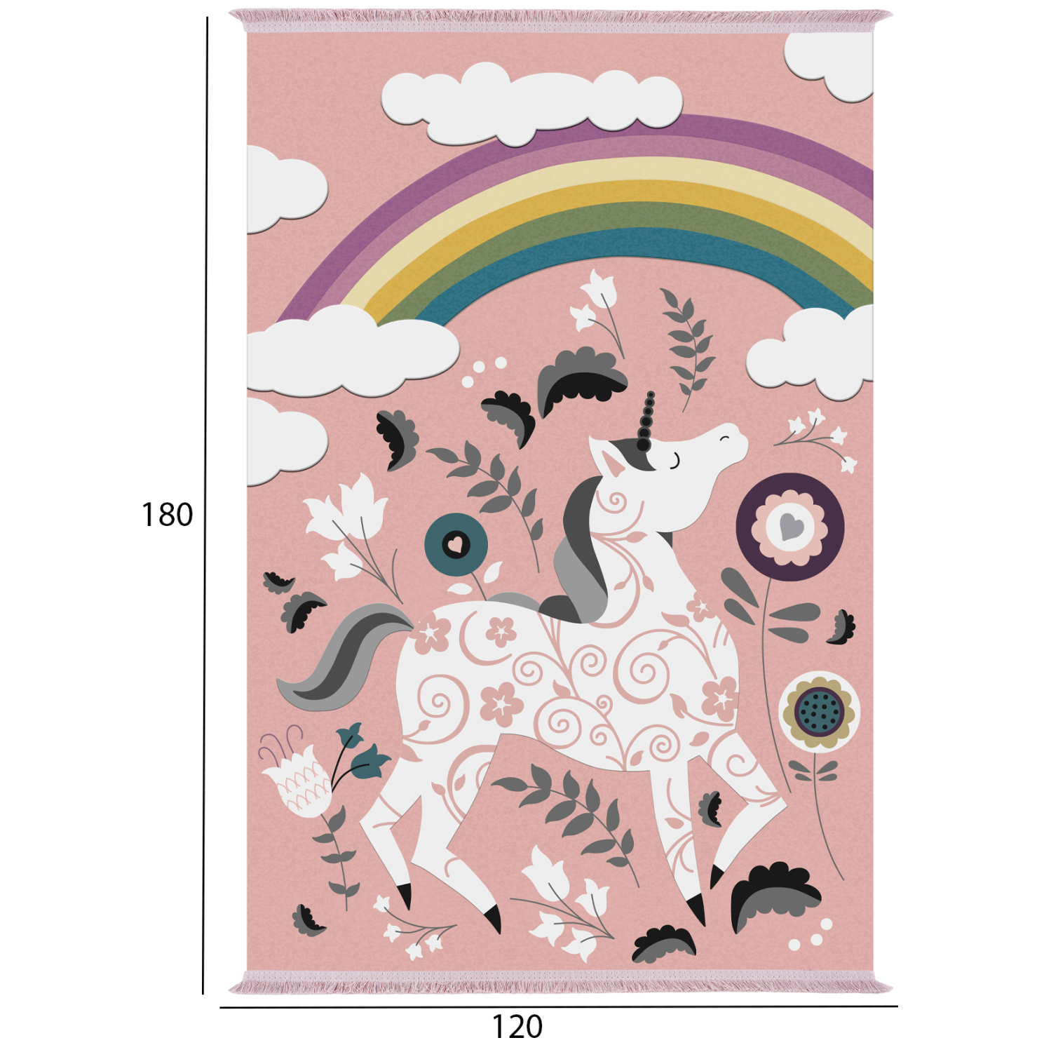 Αυτό το όμορφο χαλί με ΡΟΖ φόντο σε όλη την επιφάνεια του χαλιού, θα μαγνητίσει την φαντασία των μικρών αλλά και των μεγάλων. Το σχέδιο του χαλιού απεικονίζει έναν μονόκερο κάτω από ένα όμορφο ουράνιο τόξο ανάμεσα σε λουλούδια!