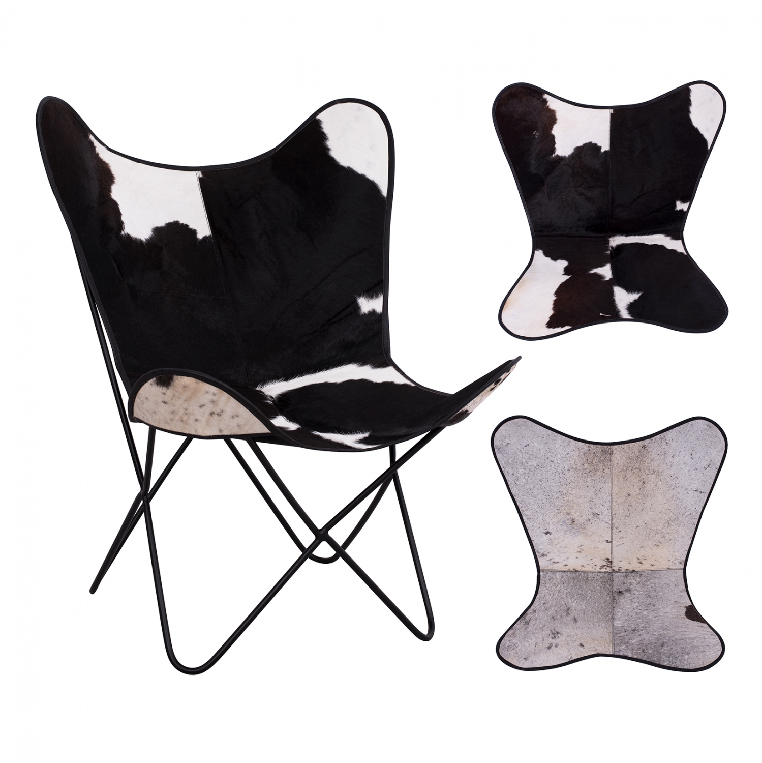 Μοντέρνα πολυθρόνα από μαύρο μεταλλικό σκελετό και γνήσιο δέρμα αγελάδος σε ασπρόμαυρη ή γκρι απόχρωση.