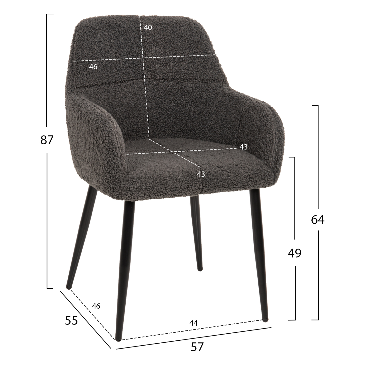 Η πολυθρόνα SHELLY είναι μοντέρνα, άνετη και σταθερή! Το κυρίαρχο χρώμα είναι το ΓΚΡΙ, ενώ τα 4 πόδια είναι σε μαύρο χρώμα. Η επένδυση της πολυθρόνας έχει γίνει με ξεχωριστό ύφασμα TEDDY που θα δώσει μια διαφορετική όψη στον χώρο σας. Πρόκειται για μια πρόταση όμορφη, κυρίως για την τραπεζαρία σας, αλλά και που θα ταιριάξει σχεδόν παντού!