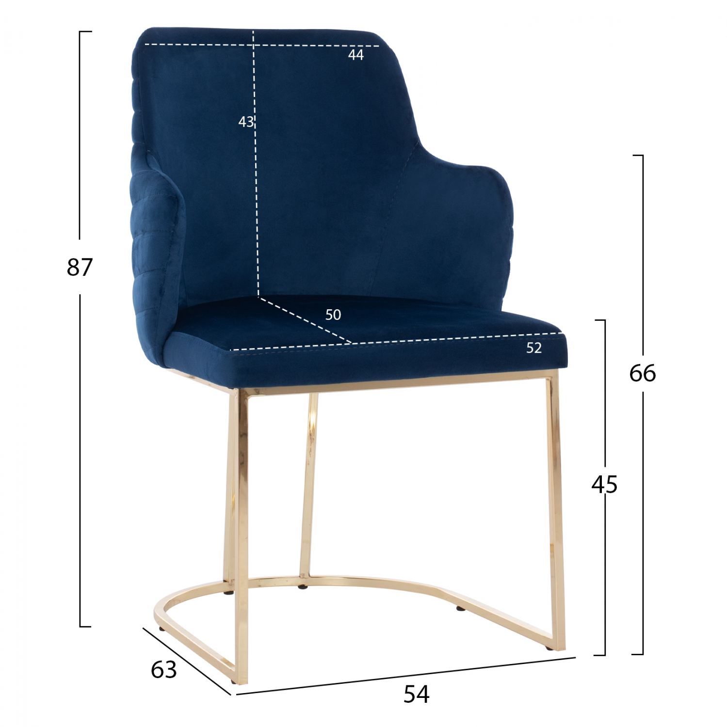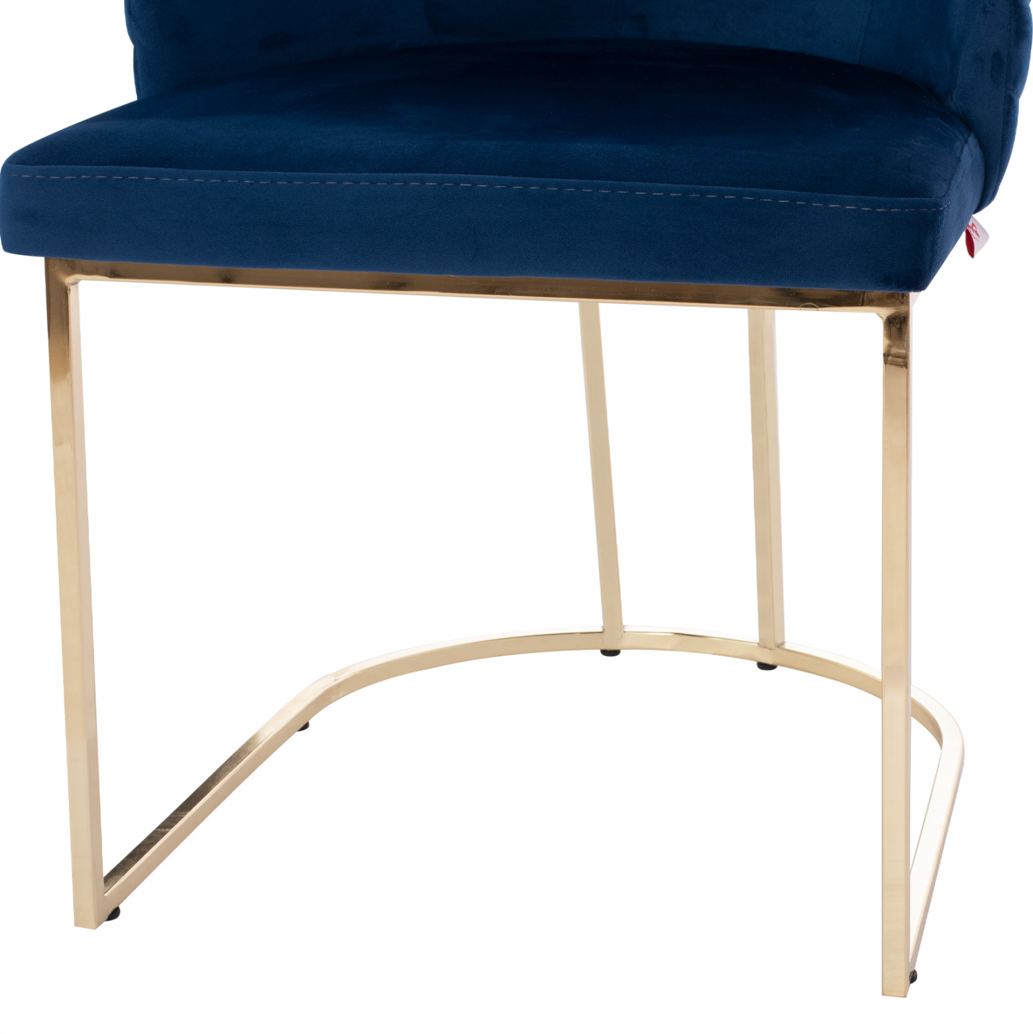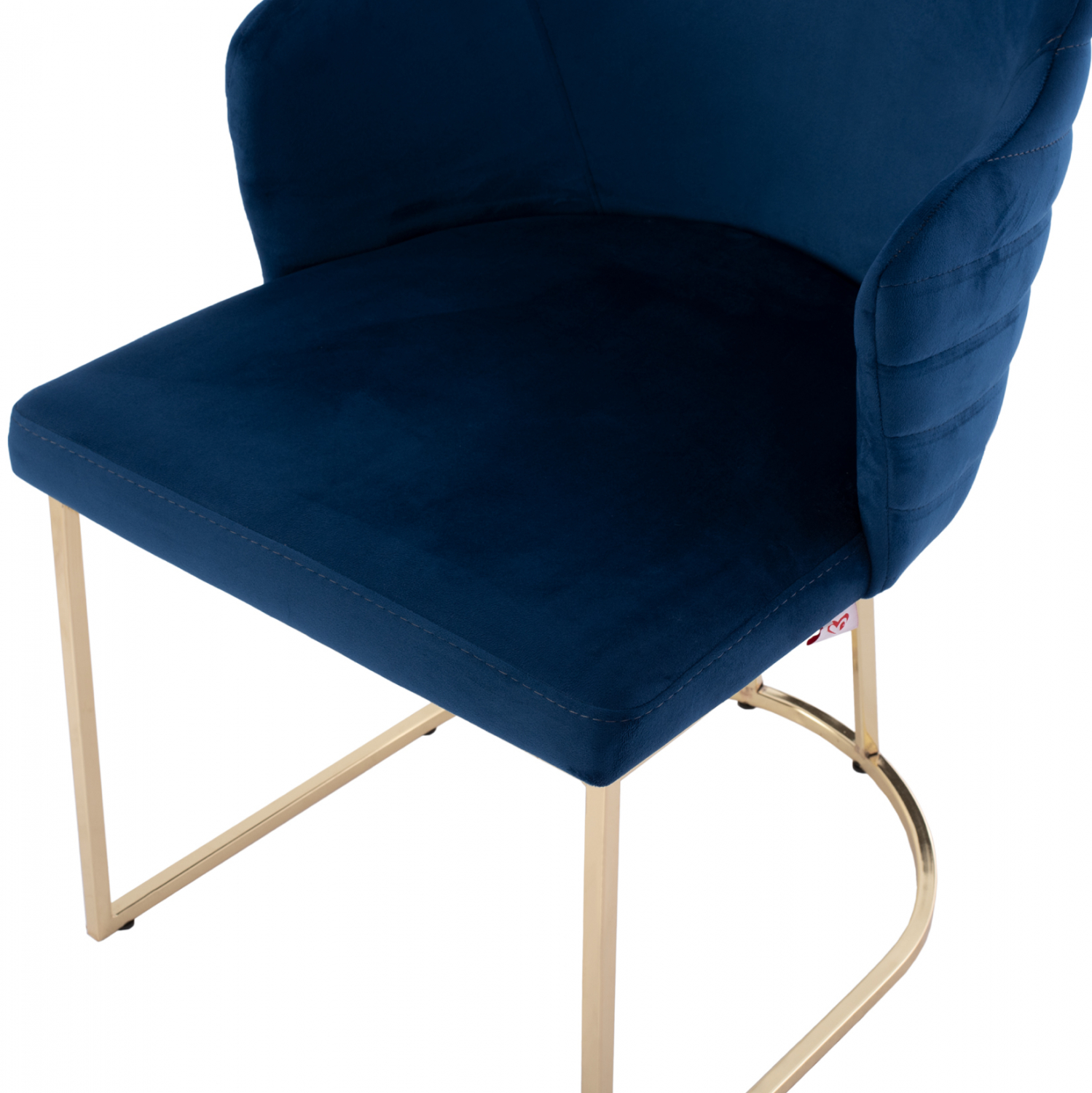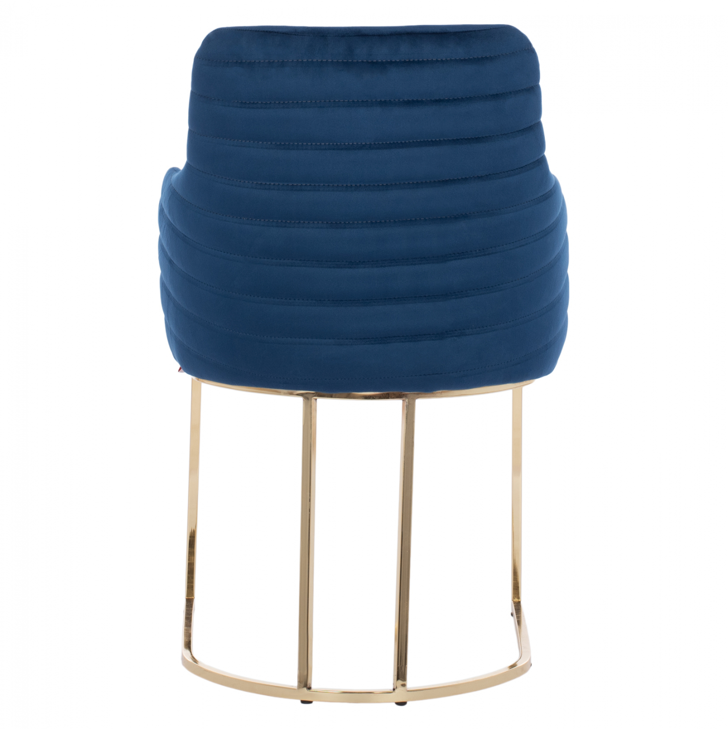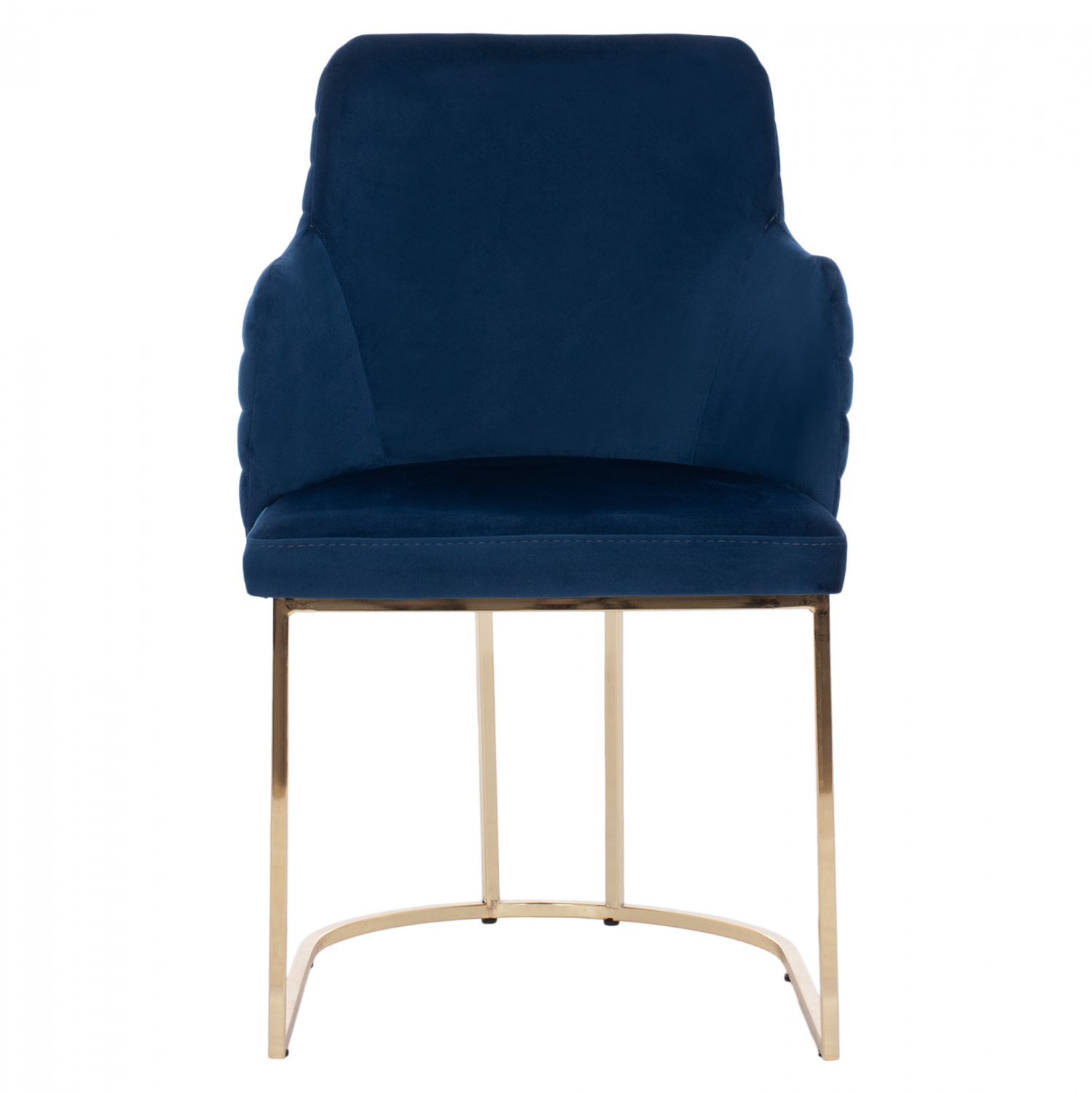 Πολυθρόνα SOLANA σε μπλε χρώμα με μεταλλικά πόδια σε χρυσή απόχρωση. Τα πόδια είναι σε ημικυκλική διάταξη με 4 κάθετα σταθερά πάνω στο μεταλλικό ημικύκλιο. Μια πολυθρόνα που δίνει κάτι το ξεχωριστό σε οποιοδήποτε επαγγελματικό χώρο. Λιτή, ποιοτική και κομψή σίγουρα θα τραβήξει τα βλέμματα. Το εξωτερικό της μεσαίου ύψους πλάτης φέρει οριζόντιες ραφές στην βελούδινη επένδυση, πράγμα που επιτείνει τον ιδιαίτερο χαρακτήρα αυτής της πολυθρόνας.