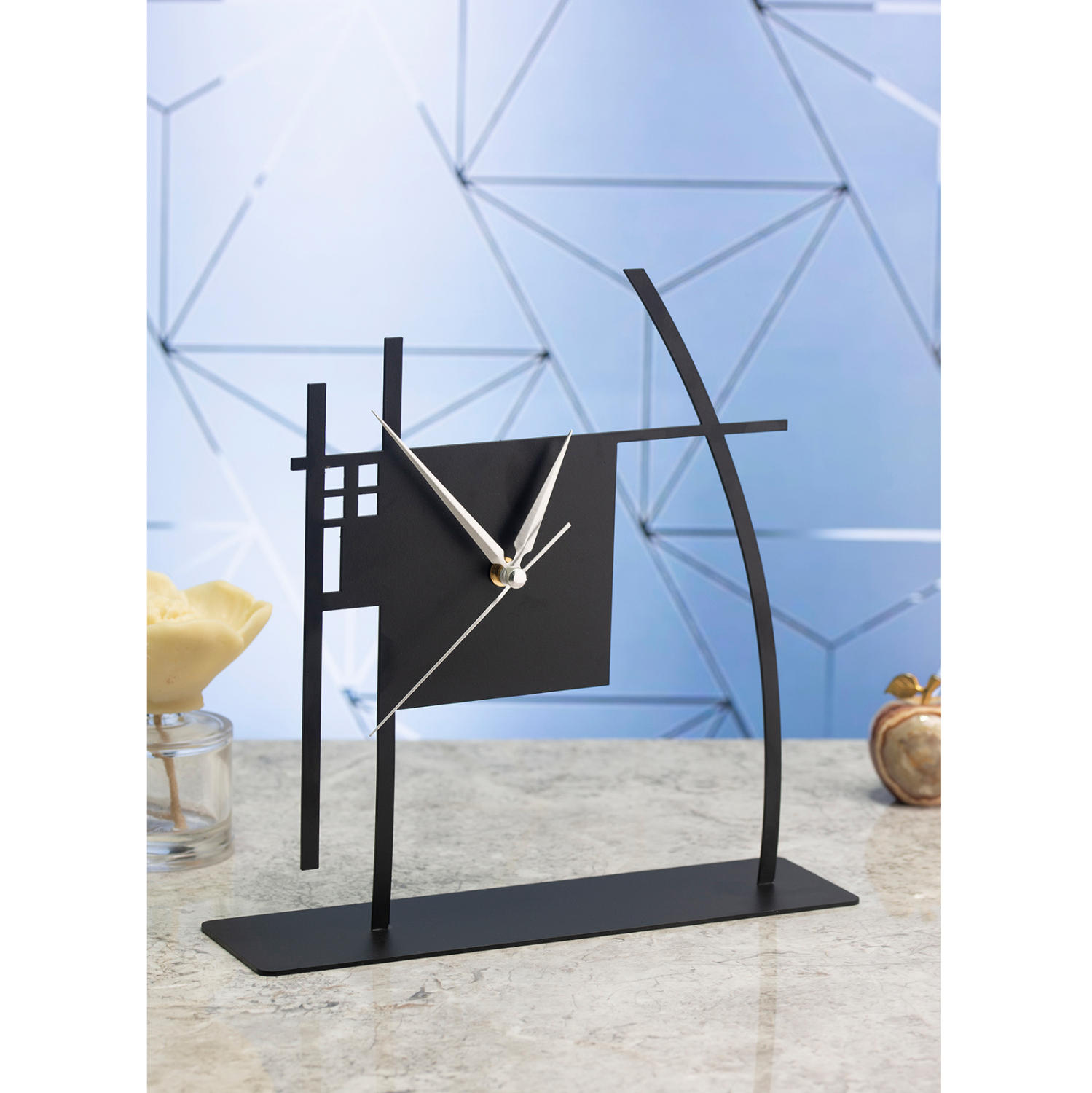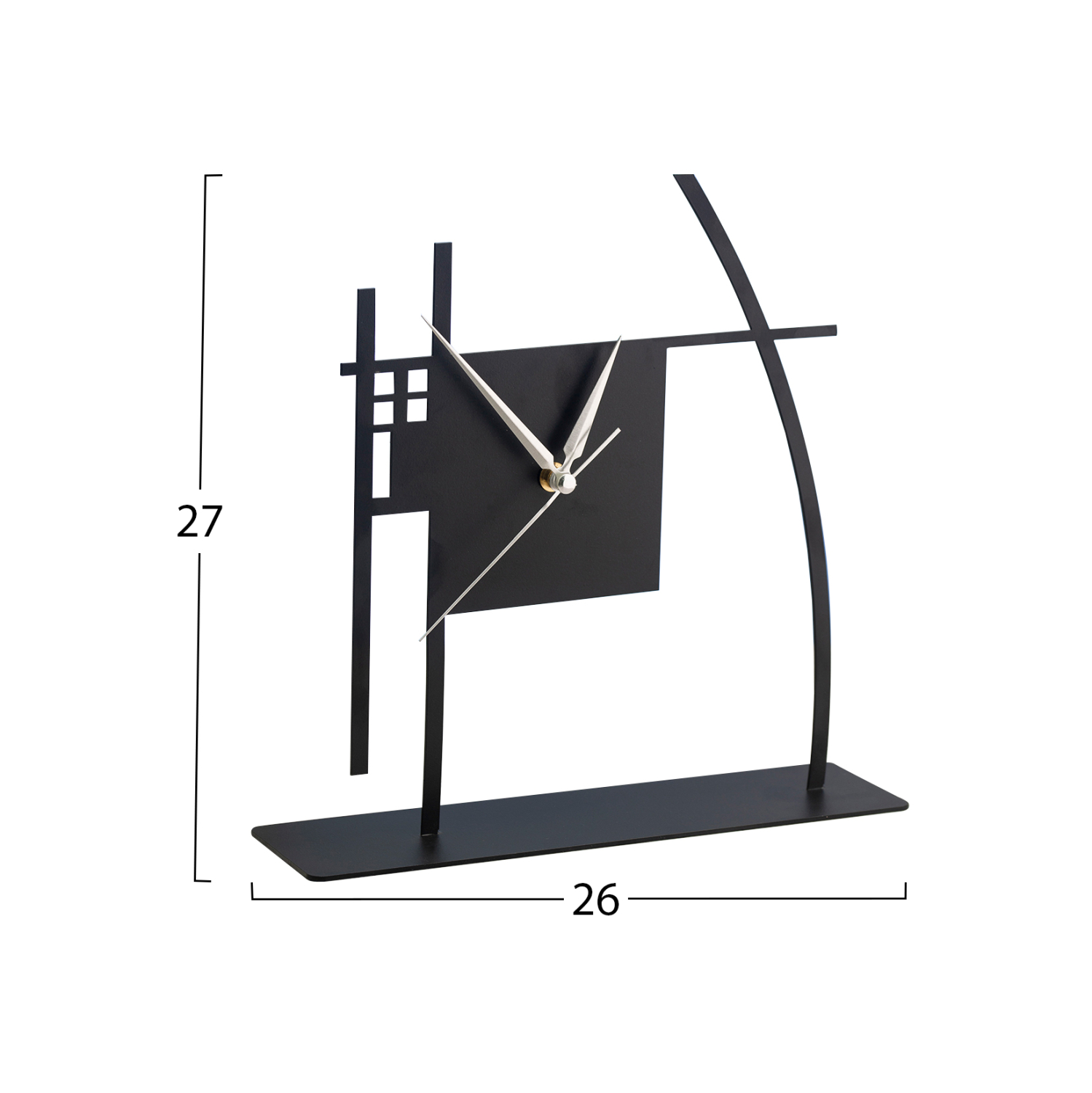 Ρολόι επιτραπέζιο σε μαύρη απόχρωση με ασημί λεπτομέρειες στους δείκτες.