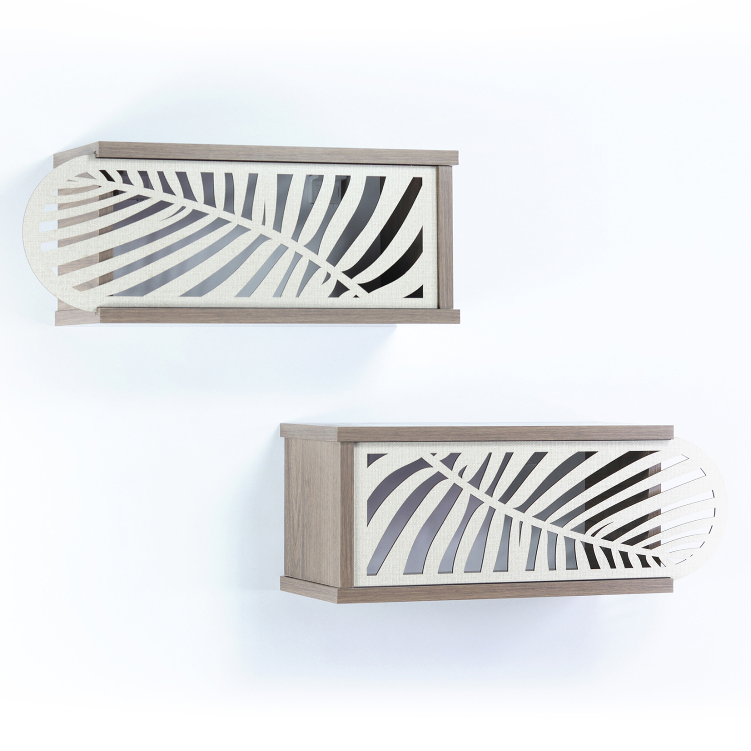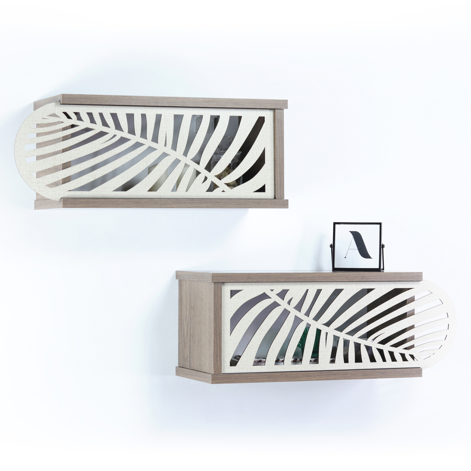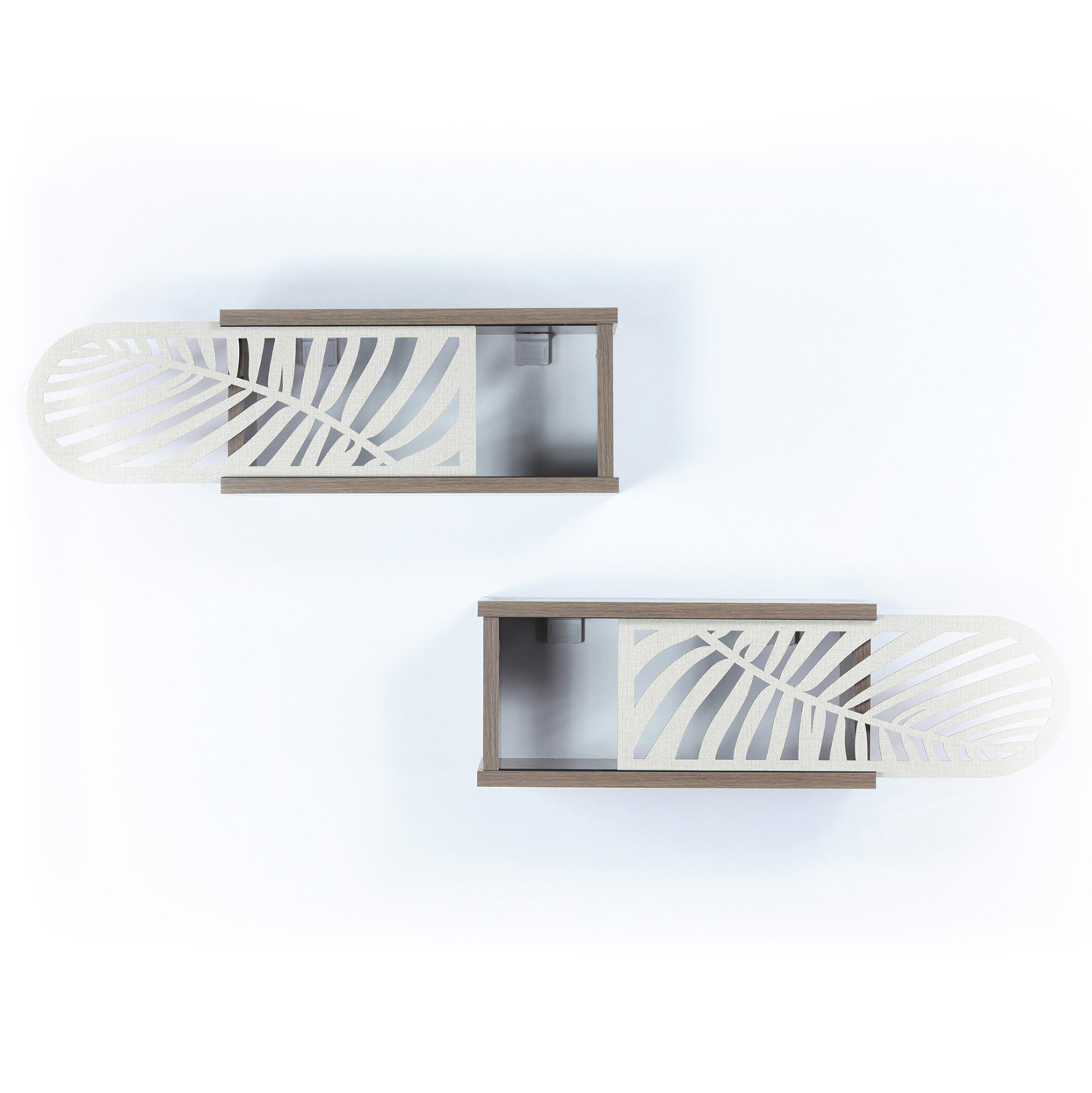 Σετ ράφια τοίχου με συρόμενα πορτάκια σε καρυδί απόχρωση με λεπτομέρειες σε εκρού χρώμα.