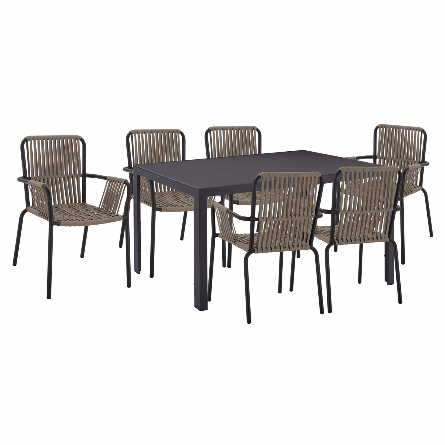 Έξι μοντέρνες πολυθρόνες εξωτερικού χώρου κατασκευασμένες από σκελετό αλουμινίου σε ανθρακί απόχρωση, επενδυμένες με πλεκτό pe πλατύ κορδόνι στην πλάτη σε καπουτσίνο απόχρωση.