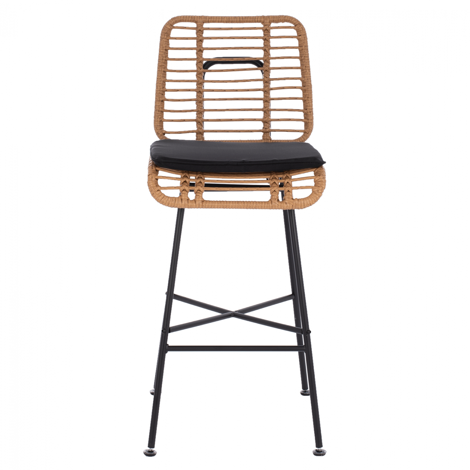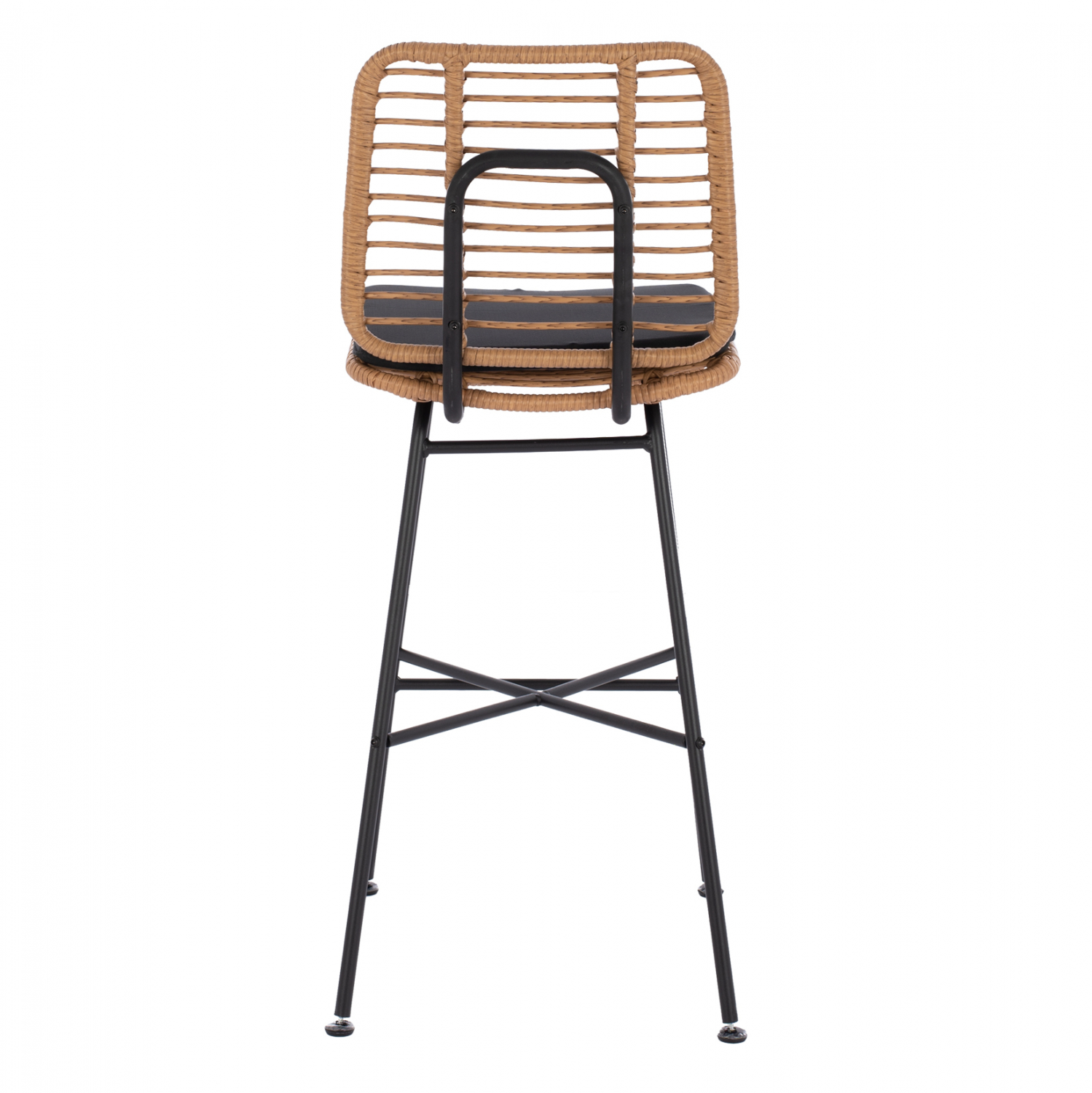 Μοντέρνο σκαμπό εξωτερικού, αλλά και εσωτερικού χώρου, κατασκευασμένο από μεταλλικό σκελετό σε μαύρη απόχρωση και πόδια από μασίφ σίδερο και επενδυμένο με πλεκτό wicker σε μπεζ απόχρωση.