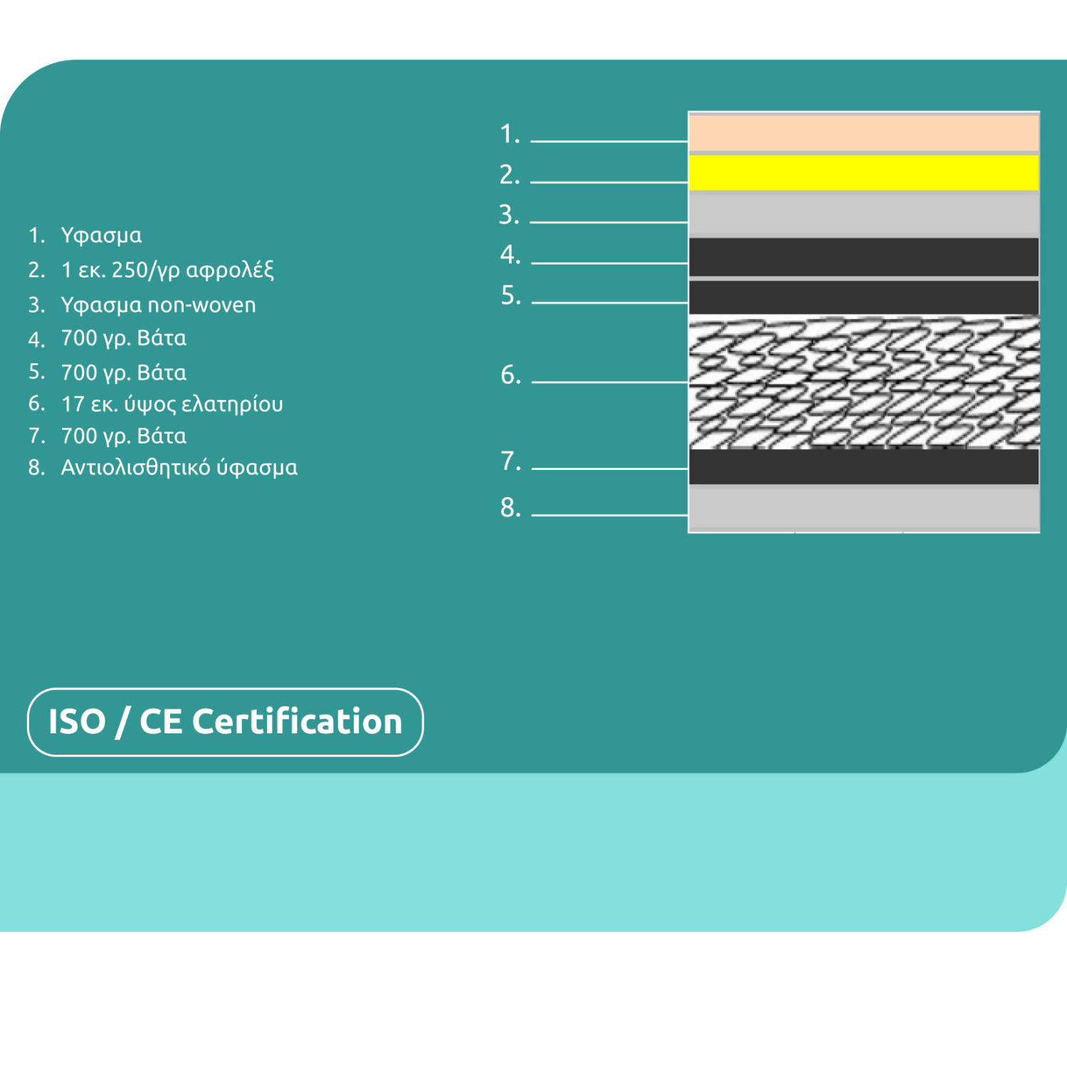 Η καρδιά του στρώματος αποτελείται από συνεχόμενα ελατήρια ύψους 17 εκ, με πάχος 1,8 χλστ.
