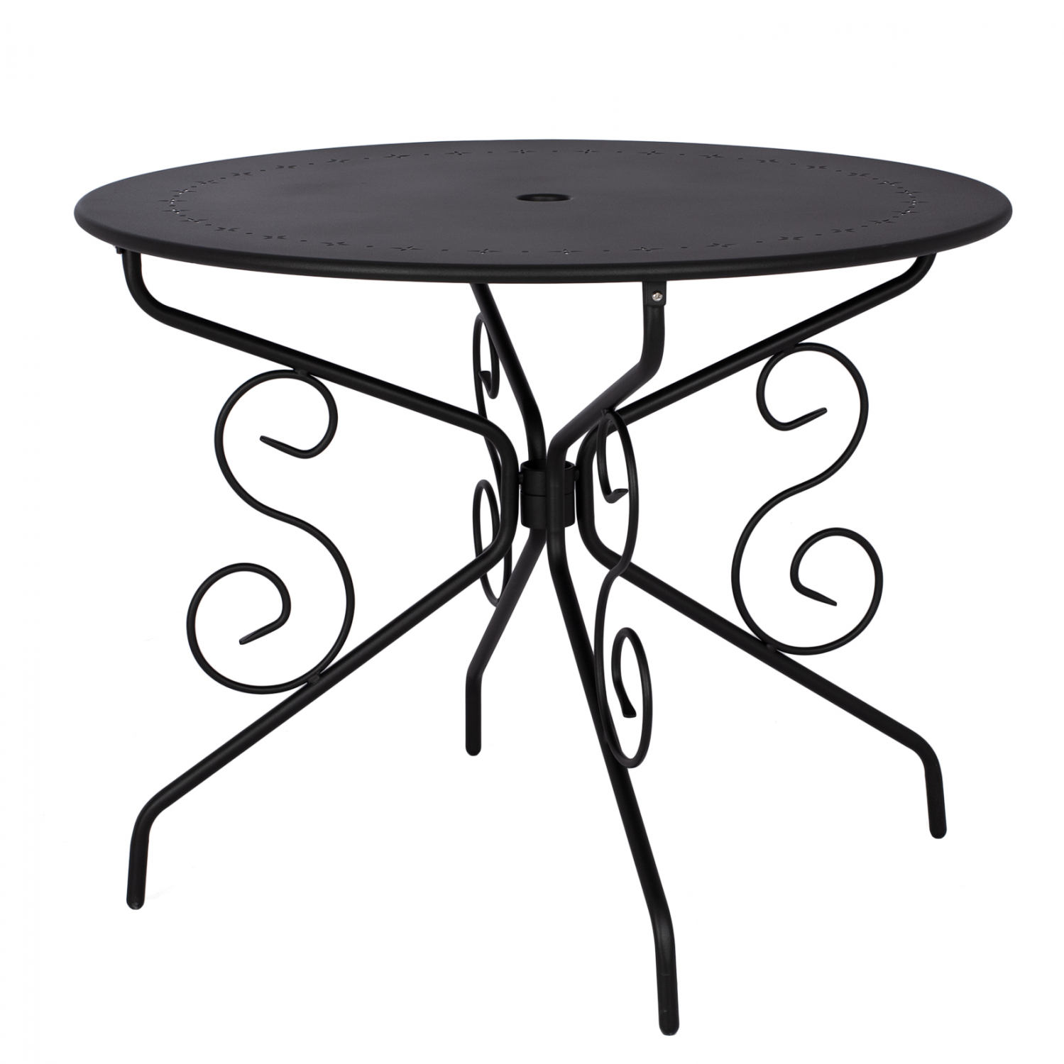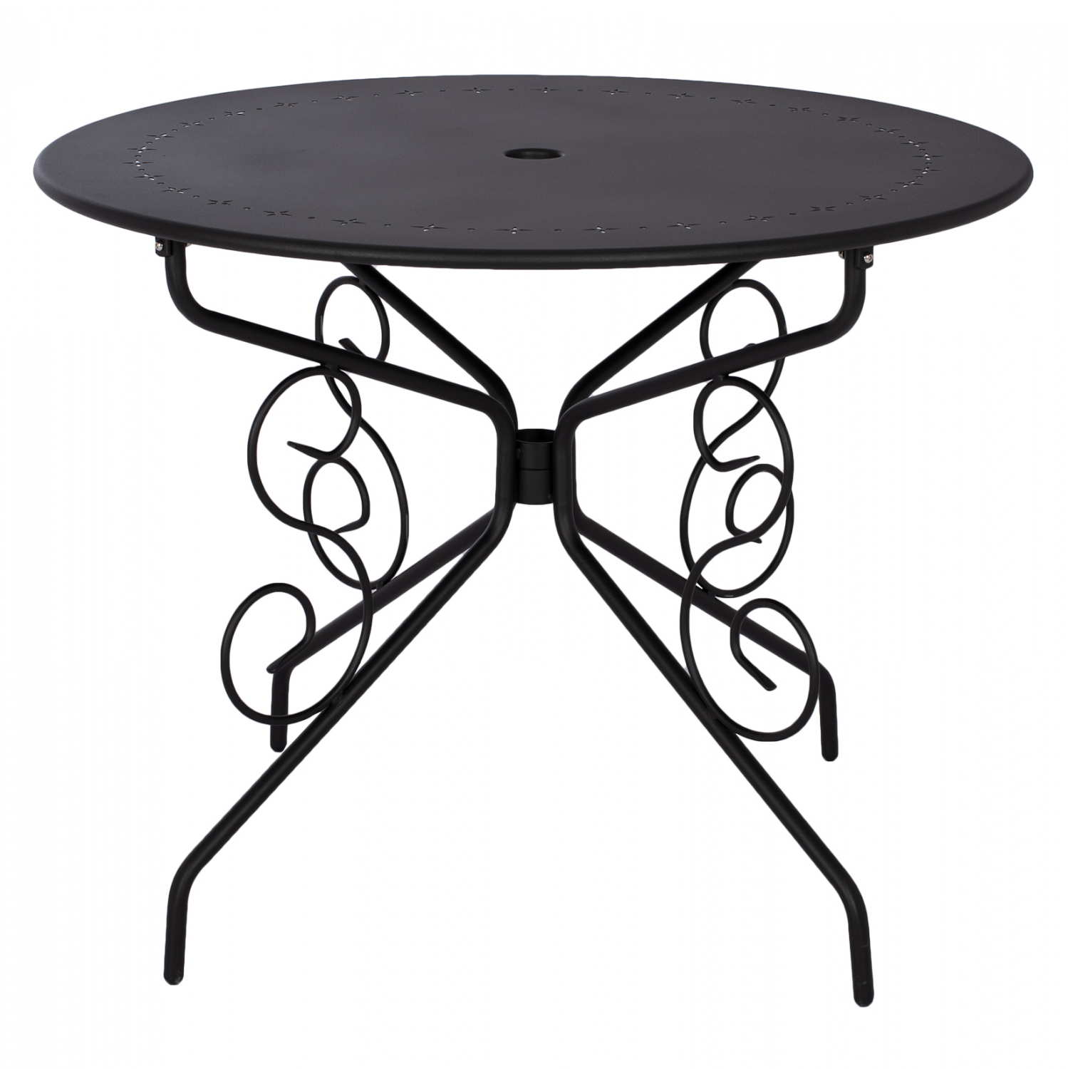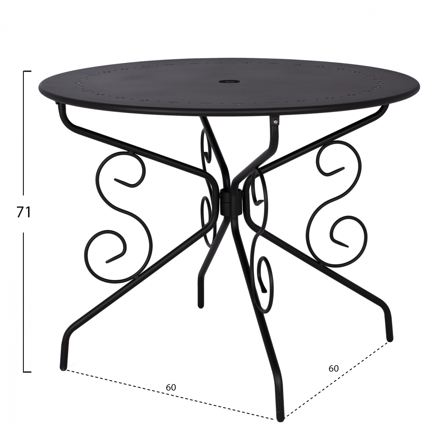 Τραπέζι μεταλλικό για εξωτερικό χώρο με θέση για ομπρέλα με εντυπωσιακά σχέδια στην βάση και την επιφάνεια του.