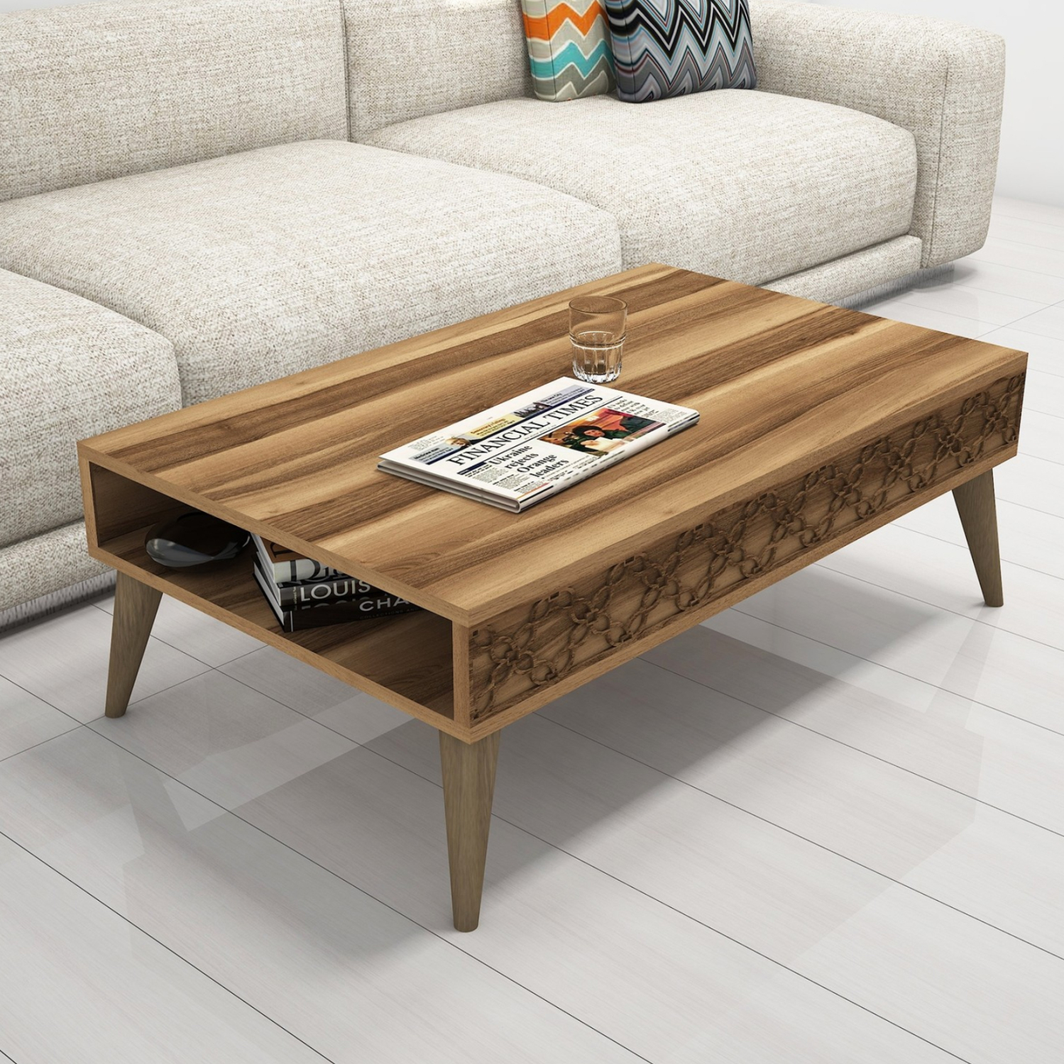 ΗΜ9499.01 τραπεζάκι σαλονιού—– Το τραπεζάκι αυτό είναι ένα όμορφο έπιπλο σε χρώμα καρυδί. Το πρακτικό του design θα αλλάξει την εικόνα του σαλονιού ή του καθιστικού σας προς το καλύτερο. Πρόκειται για μια κατασκευή με μια ικανοποιητικού μεγέθους επάνω επιφάνεια. Από κάτω υπάρχει ανοιχτός αποθηκευτικός χώρος σαν δεύτερη επιφάνεια. Το χαρακτηριστικό, όμως, σε αυτό το τραπεζάκι είναι ότι στα πλαϊνά υπάρχει σκαλιστό σχέδιο με μηχανικά μέσα (CNC Relief). Η κομψότητα, η ποιότητα και το minimal πρακτικό design χαρακτηρίζουν αυτό το τραπεζάκι, που έχει φτιαχτεί για εσένα.