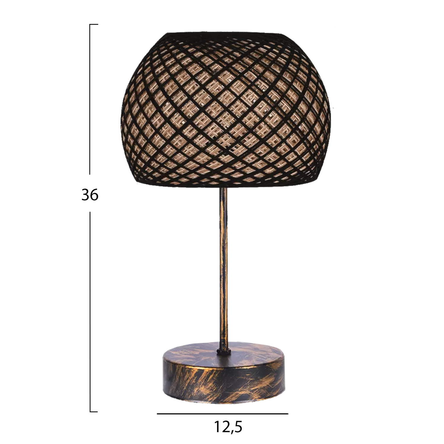 Η βάση και η κολώνα του φωτιστικού είναι μεταλλικά. Το καπέλο είναι κατασκευασμένο από σχοινί γιούτας.
