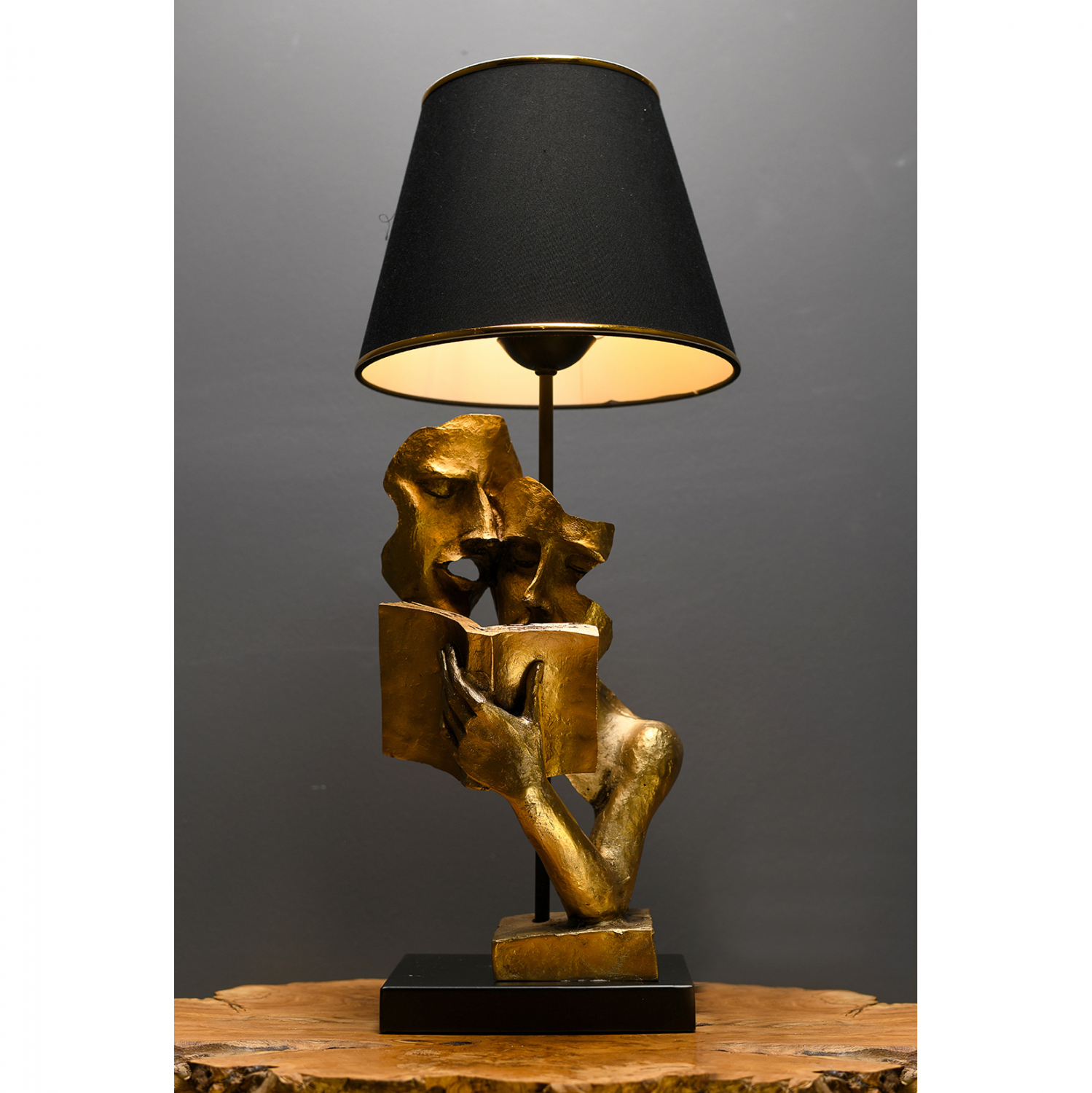 Επιτραπέζιο φωτιστικό, σε απόχρωση μαύρο με χρυσό. Το καπέλο είναι από PVC, ενώ η φιγούρα σε χρυσό χρώμα είναι από συμπαγή πολυεστέρα.