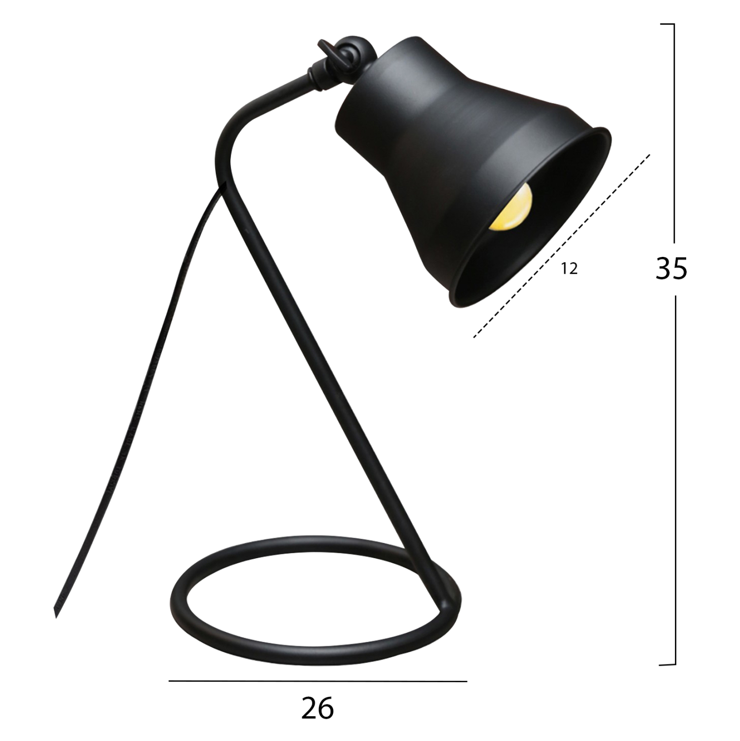 Μοντέρνο φωτιστικό γραφείου με μεταλλική βάση δακτύλιο, κολώνα από μονή ράβδο και μεταλλικό «καπέλο» σε μαύρο χρώμα.