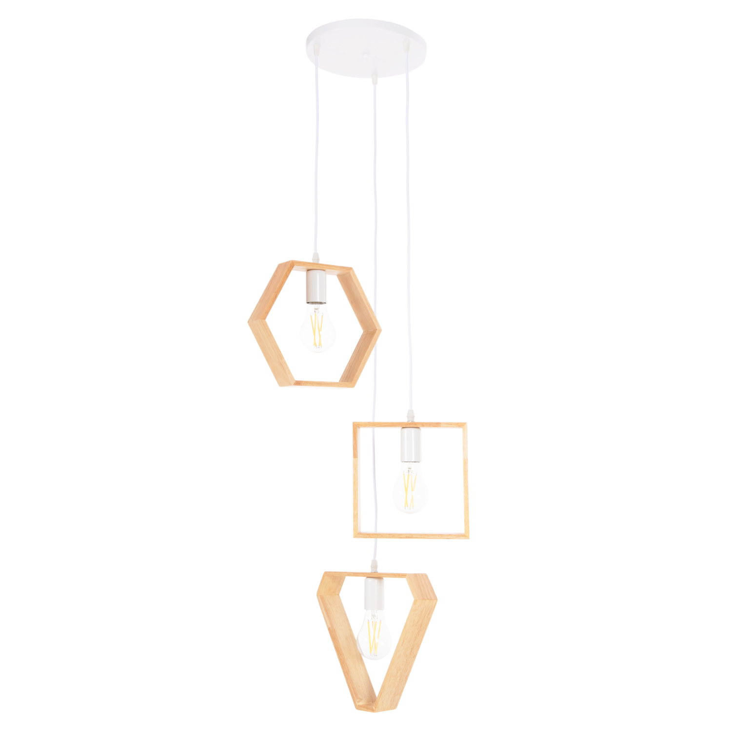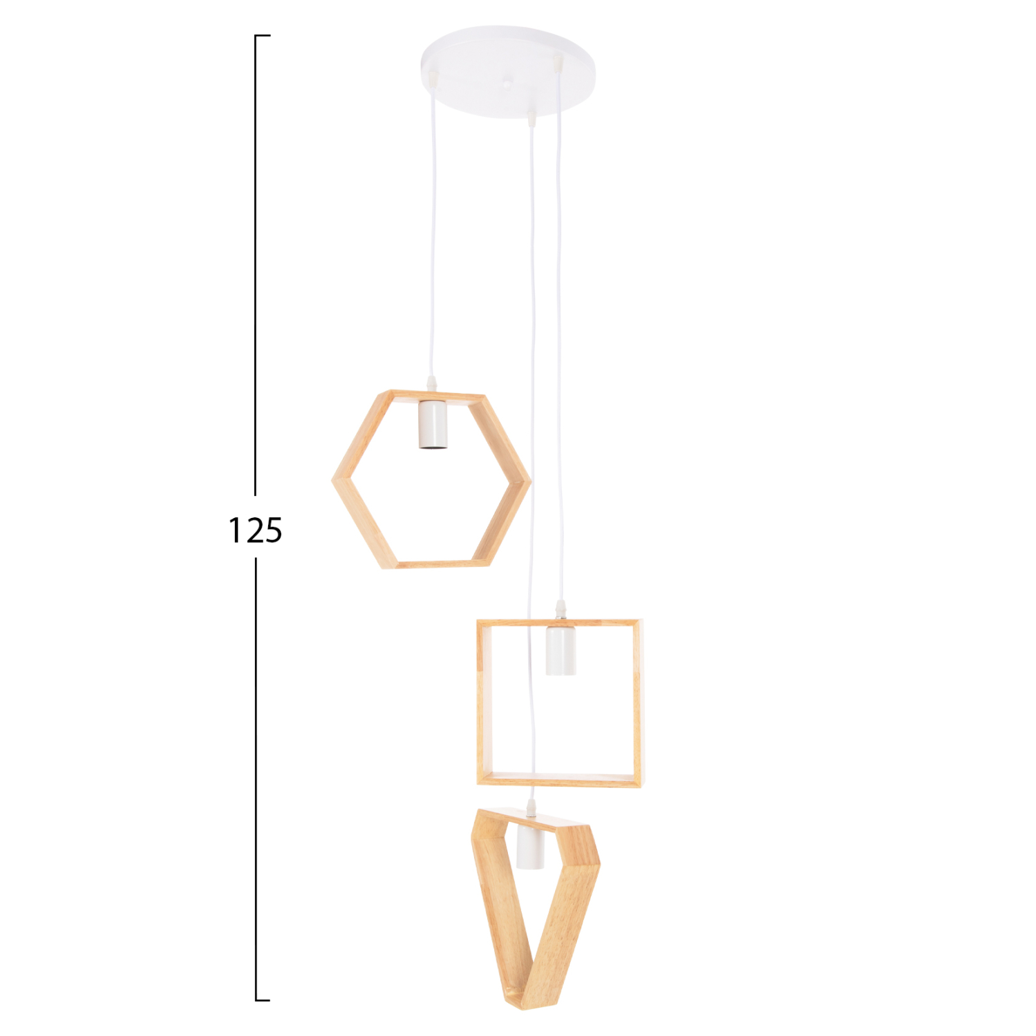 HΜ4072—Γνωρίστε το νέο πρωτότυπο και φινετσάτο 3-ΦΩΤΟ οροφής στην γκάμα μας και ολοκληρώστε την διακόσμησή σας. Τα ξύλινα γεωμετρικά σχήματα του τετραγώνου, του εξαγώνου, και του τριγώνου σε διαφορετικά ύψη και σε φυσικό χρώμα ξύλου σε συνδυασμό με τα λευκά καλώδια κρέμασης είναι η επιτομή του μοντέρνου design στα φωτιστικά οροφής.