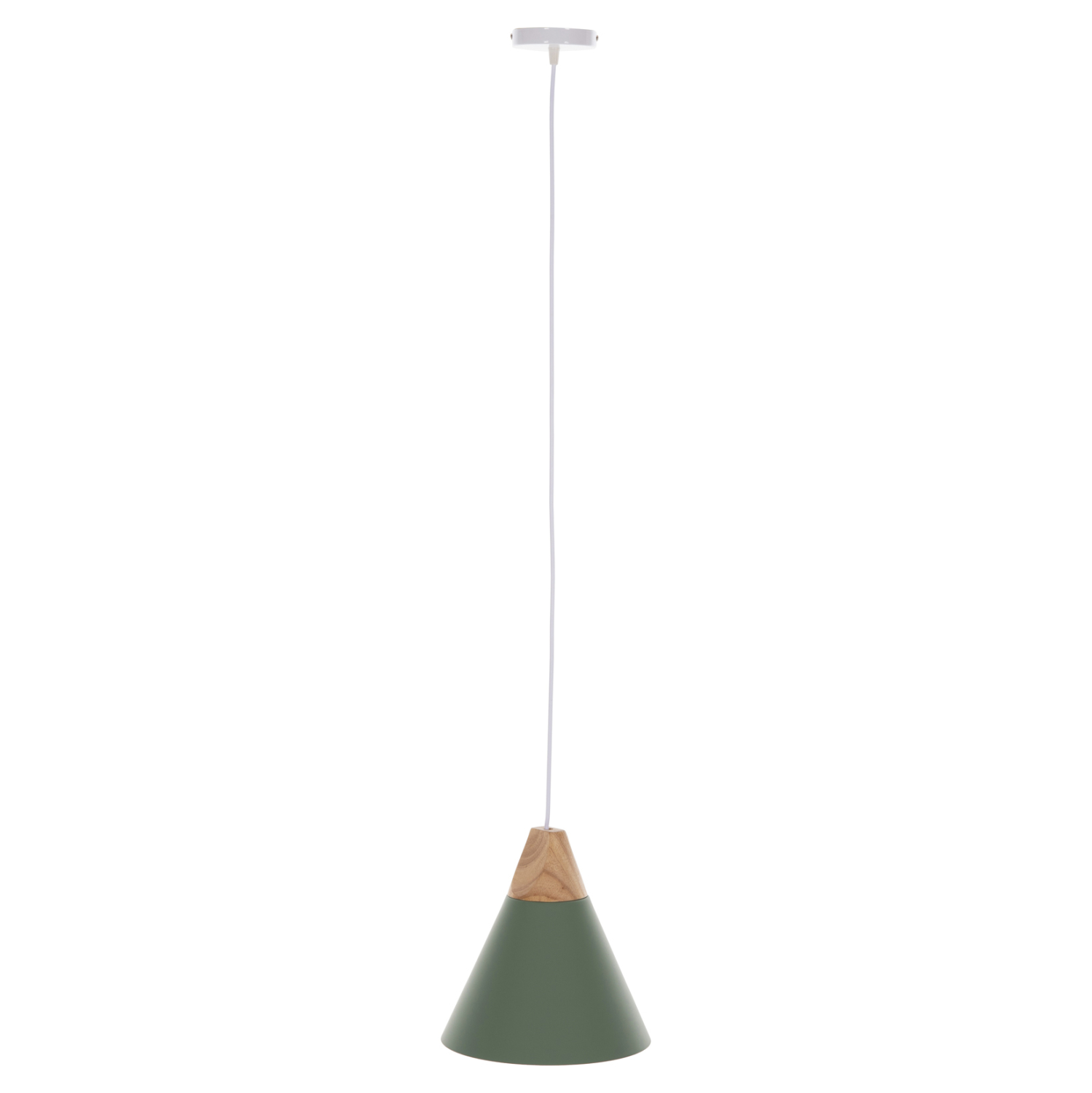 Ανακαλύψτε αυτό το νέο μας κρεμαστό φωτιστικό οροφής και ολοκληρώστε την διακόσμησή σας. Πρόκειται για ένα φωτιστικό με ΠΡΑΣΙΝΟ μεταλλικό καπέλο σε σχήμα καμπάνας με λεπτομέρεια ξύλου στην κορυφή του φωτιστικού. Αισθητικά, ολοκληρώνεται με το λευκό καλώδιο κρέμασης και την λευκή βάση οροφής, και αποτελεί την τελευταία τάση στα φωτιστικά οροφής.