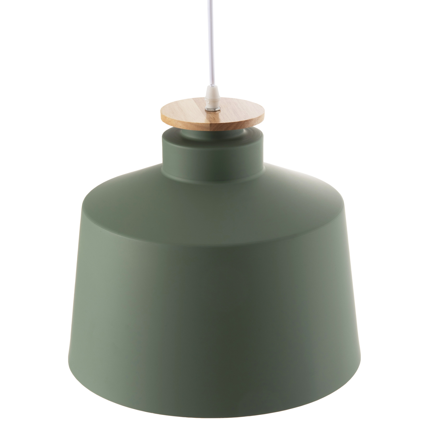 Ανακαλύψτε αυτό το νέο μας κρεμαστό φωτιστικό οροφής και ολοκληρώστε την διακόσμησή σας. Πρόκειται για ένα φωτιστικό με ΠΡΑΣΙΝΟ καπέλο ΑΛΟΥΜΙΝΙΟΥ σε σχήμα καμπάνας με λεπτομέρεια ξύλου στην κορυφή του φωτιστικού. Αισθητικά, ολοκληρώνεται με το λευκό καλώδιο κρέμασης και την λευκή βάση οροφής, και αποτελεί την τελευταία τάση στα φωτιστικά οροφής.