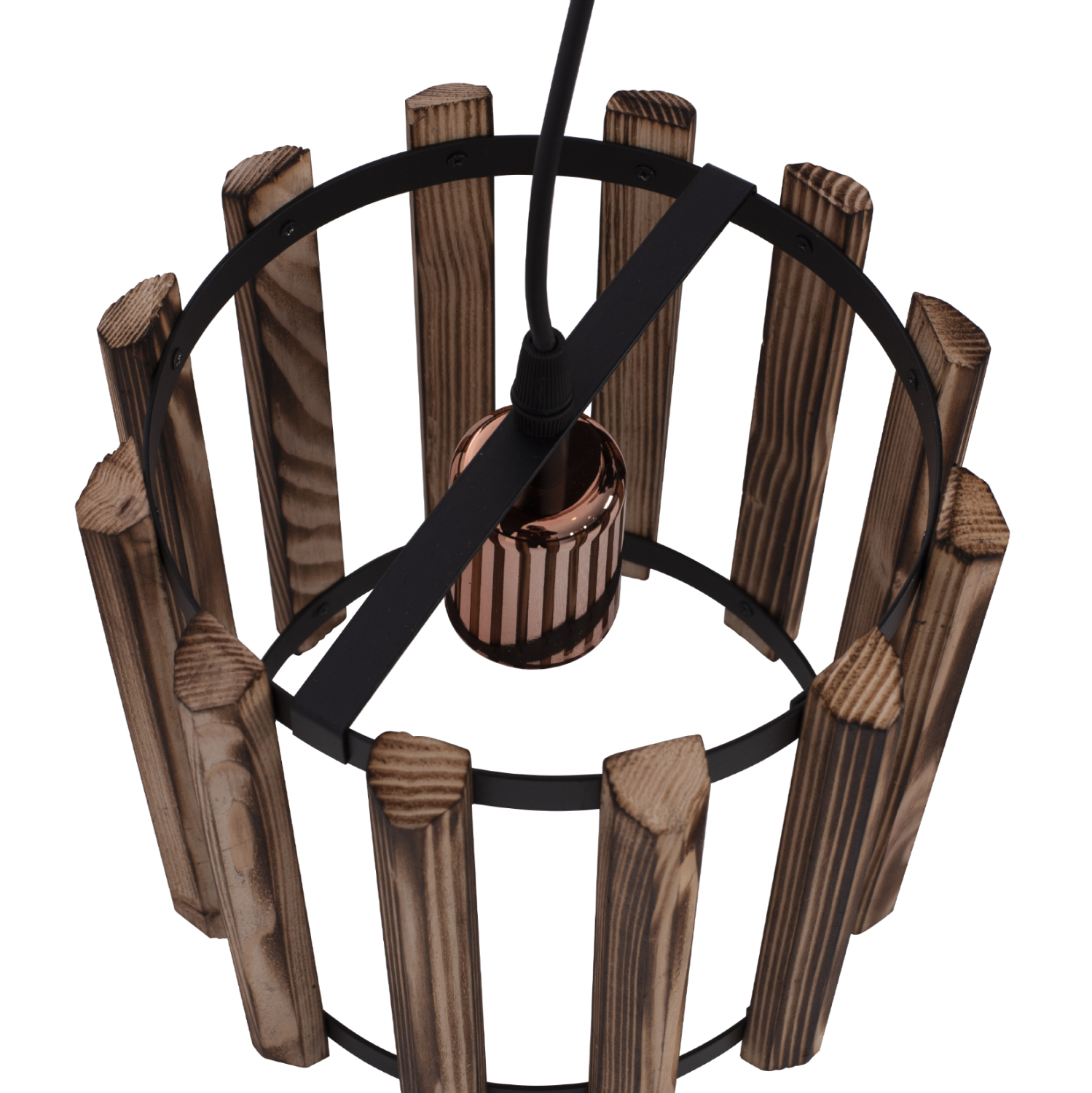 Hm7704.01-κρεμαστό φωτιστικό —-Αφήστε το φως να απλωθεί στον χώρο με ένα πρωτότυπο μονόφωτο οροφής, ολοκληρώνοντας την διακόσμησή σας. Το «καπέλο» του φωτιστικού αποτελείται από δύο μαύρους μεταλλικούς δακτυλίους πάνω στους οποίους είναι μονταρισμένες σε κάθετη διάταξη, ξύλινες βέργες σε φυσικό χρώμα. Το χαρακτηριστικό αυτού του φωτιστικού είναι ότι το ντουί της λάμπας είναι σε γυαλιστερό μπρούτζινο χρώμα, δημιουργώντας μια ιδιαίτερη διχρωμία με την υπόλοιπη κατασκευή.