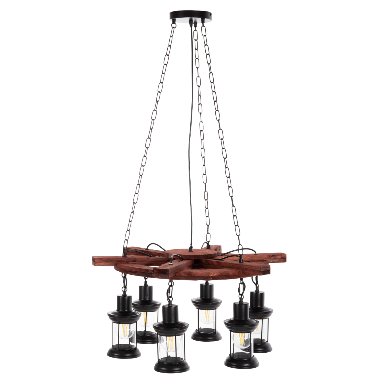Ανακαλύψτε το εντυπωσιακό 6-φωτο φωτιστικό οροφής HM4116. Ένα φωτιστικό που θα αποτελέσει το κέντρο του ενδιαφέροντος χάρη στο εντυπωσιακό και εμπνευσμένο του design. Τα 6 φαναράκια που περιέχουν τους λαμπτήρες κρέμονται από μια ξύλινη τιμονιέρα πλοίου (πηδάλιο), η οποία με την σειρά της κρέμεται από την οροφή με αλυσίδες.