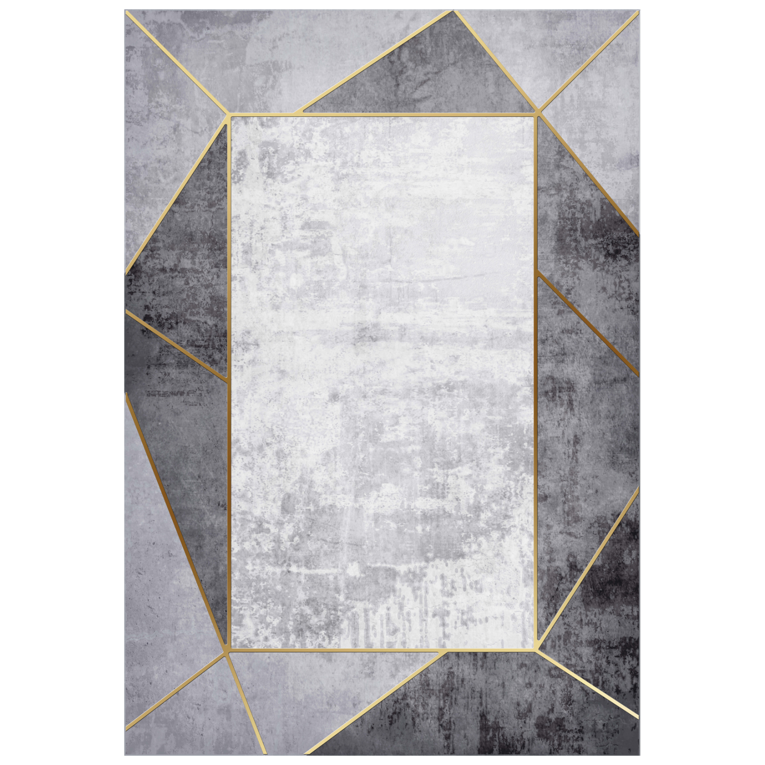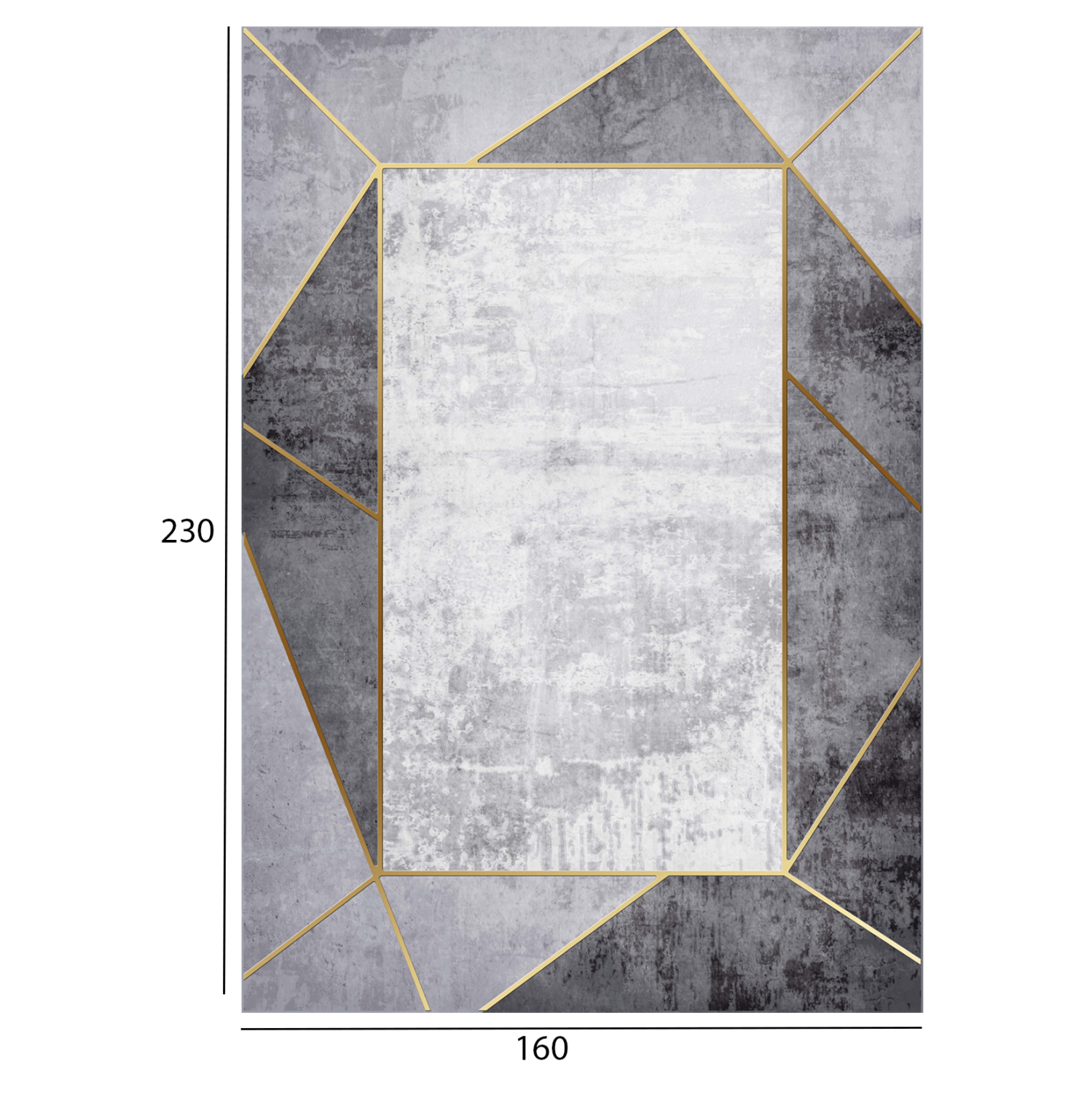 Αυτό το μοντέρνο χαλί έχει κυρίαρχα χρώματα το άσπρο, το γκρι σε δύο αποχρώσεις, και το χρυσό στις γραμμές. Το έντονο χαρακτηριστικό του είναι το λευκό ορθογώνιο στο κέντρο του χαλιού που μοιάζει με καθρέφτη με χρυσό πλαίσιο. Ένα μοντέρνο χαλί που θα τραβήξει τα βλέμματα και θα αναβαθμίσει αισθητικά το σαλόνι σας.