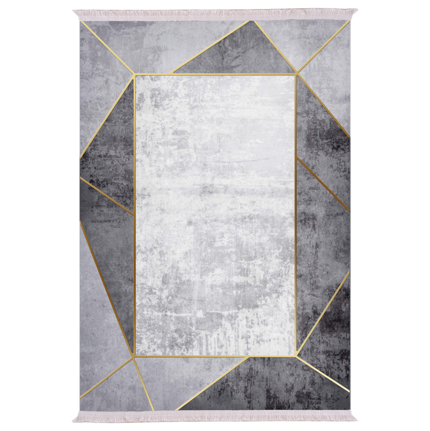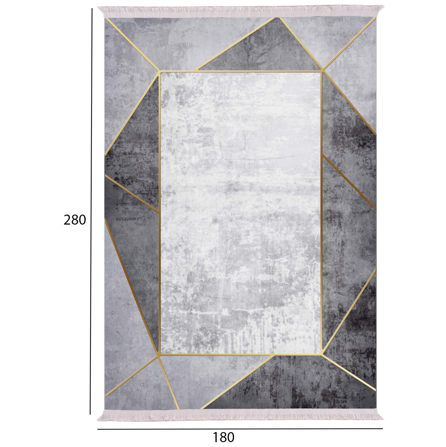 Αυτό το μοντέρνο χαλί με κρόσια έχει κυρίαρχα χρώματα το άσπρο, το γκρι σε δύο αποχρώσεις, και το χρυσό στις γραμμές. Το έντονο χαρακτηριστικό του είναι το λευκό ορθογώνιο στο κέντρο του χαλιού που μοιάζει με καθρέφτη με χρυσό πλαίσιο. Ένα μοντέρνο χαλί που θα τραβήξει τα βλέμματα και θα αναβαθμίσει αισθητικά το σαλόνι σας.